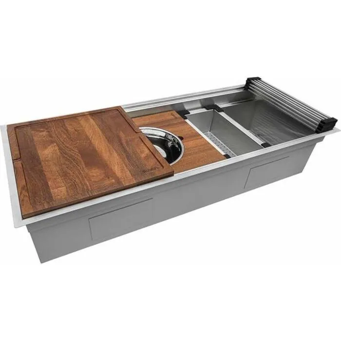 Includes 2 cutting boards (17-inch x 16-inch) that will fit on either top or lower track, so you can slide one on top of the other. The cutting boards are flat on one side, but when flipped, convert into a tray with raised edges. When you need more prep space, the two cutting boards placed side by side on the top or lower track will cover almost your entire sink.