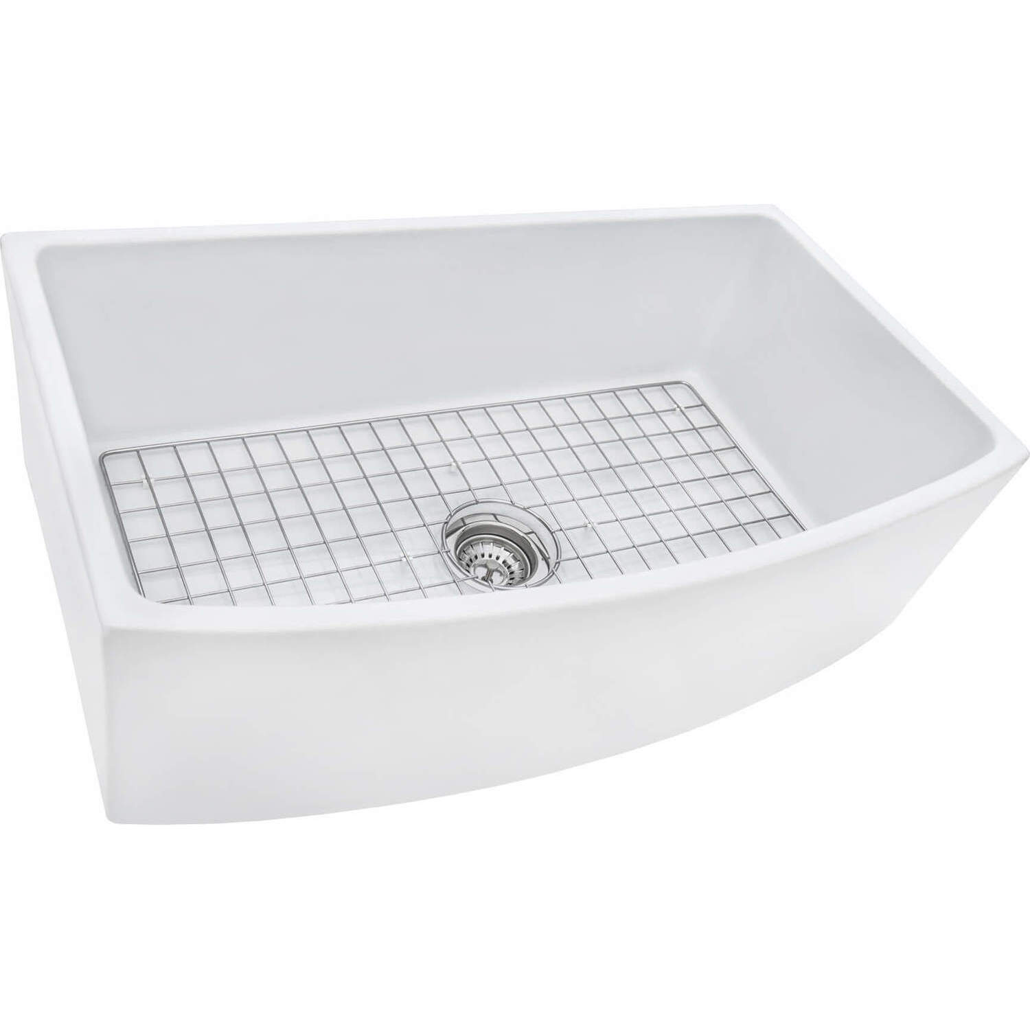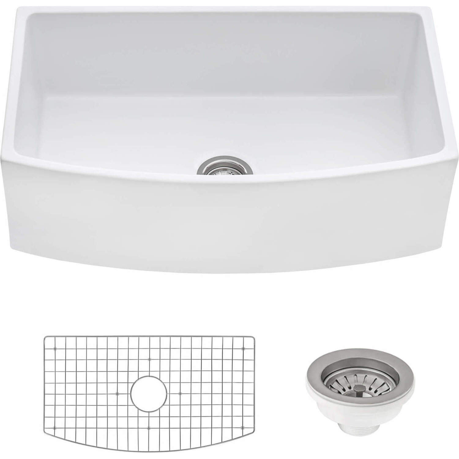- INCLUDED IN BOX: Fireclay sink, bottom rinse grid, drain assembly, installation guide.
