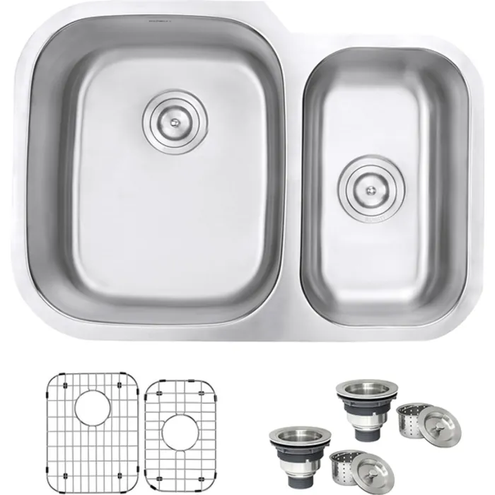 - Included in box: Sink, cut-out template, mounting brackets, rinse grids (set of 2), 2 basket strainers