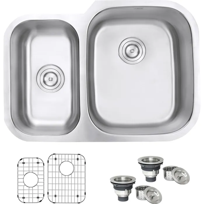 - Included in box: Sink, cut-out template, mounting brackets, rinse grids (set of 2), 2 basket strainers