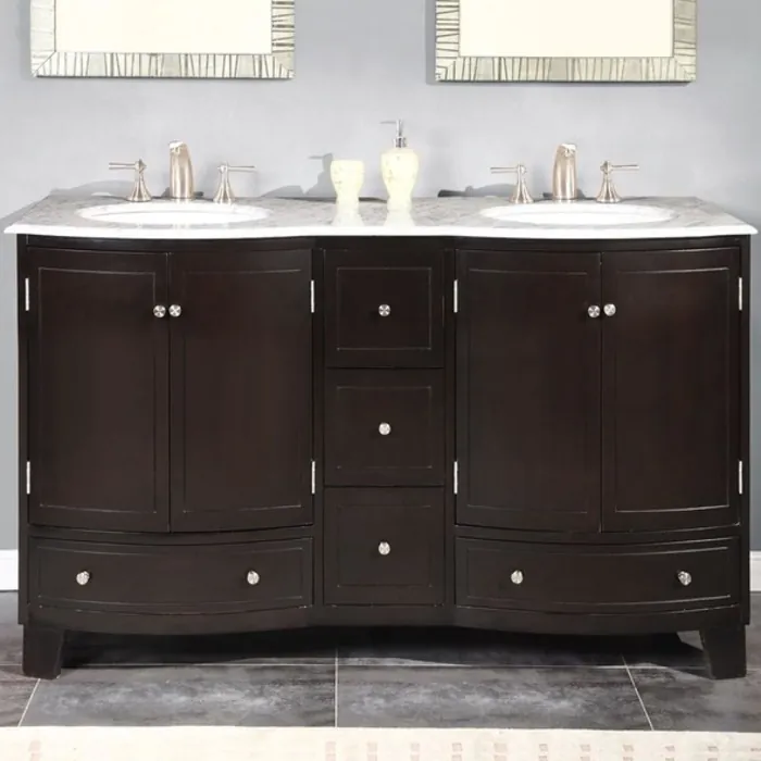 Silkroad Exclusive 60 inch Double Sink Cabinet - Carrara White Marble Top, Under Mount, White Ceramic Sink (3 holes) in Dark Espresso HYP-0703-WM-UWC-60
