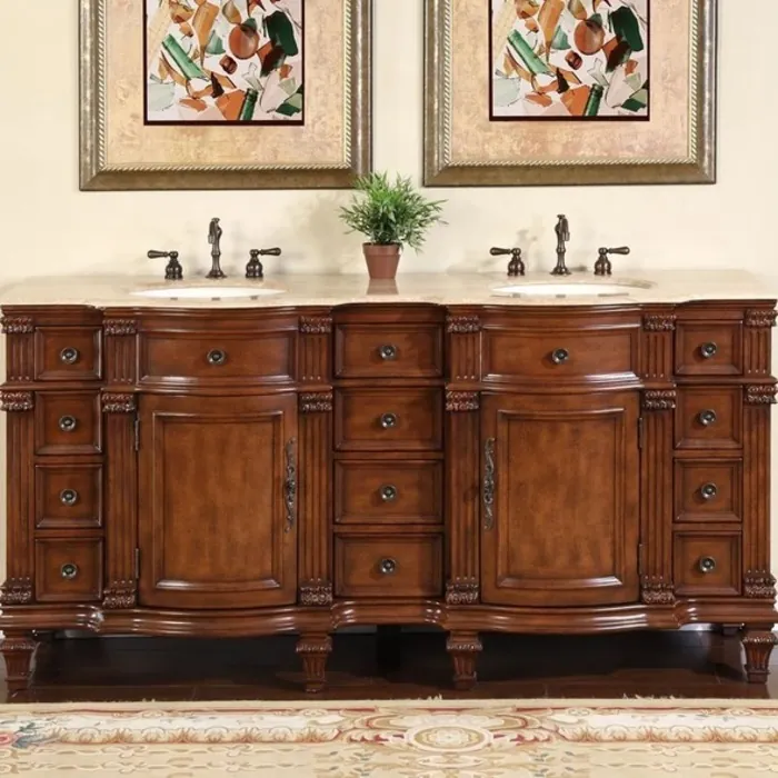 Silkroad Exclusive 72 inch Double Sink Cabinet - Travertine Top, Undermount Ivory Ceramic Sinks (3-hole) in Brazilian Rosewood HYP-0722-T-UIC-72