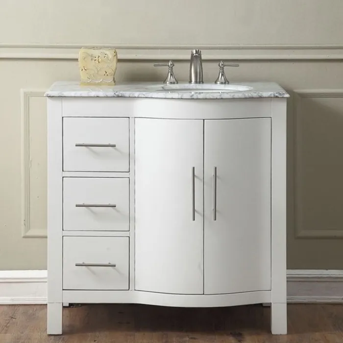Silkroad Exclusive 36 inch Single (Right) Sink Cabinet - Carrara White Marble Top, Under Mount, White Ceramic Sink (3 holes) in White V0290WW36R