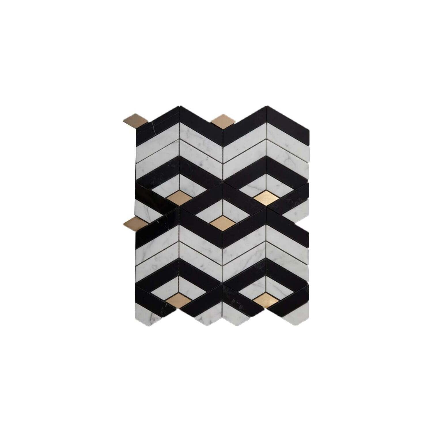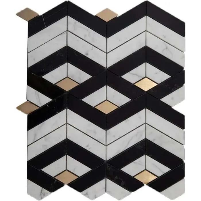 Experience unparalleled sophistication with the Soci Tile SSH-313, a high-end mosaic tile from the Classic Series. This polished marble mosaic tile, showcasing a striking Hayden pattern, blends luxurious black and white marbles with elegant brushed gold metal accents, perfect for creating an aesthetically pleasing environment in various spaces.