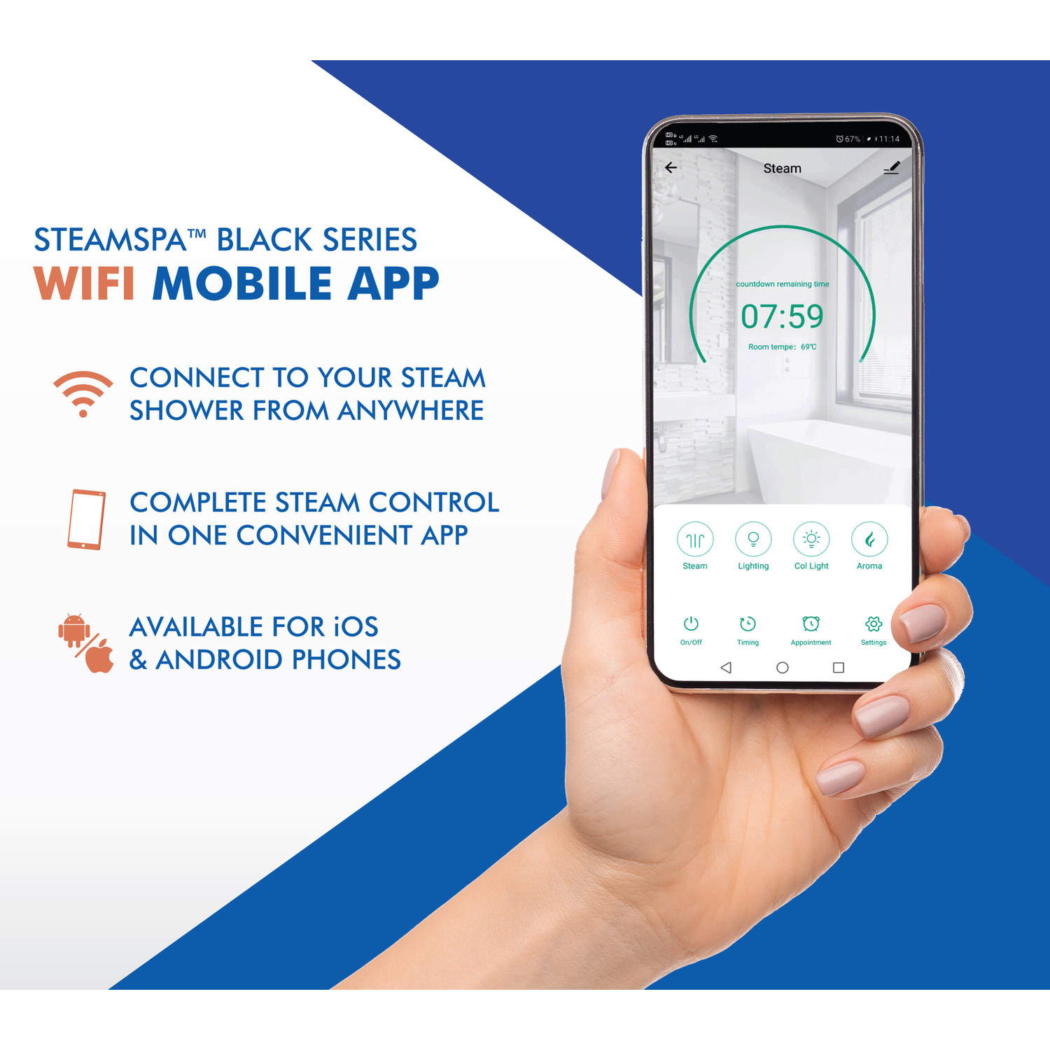 SteamSpa WIFI and BLUETOOTH BLACK SERIES delivers total control over your steam spa bath experience right from your phone. The new sleek, modern, console features a backlit touch screen display with intuitive controls and Bluetooth connectivity so you can listen to your favorite music, radio, podcasts and more. Set your steam to the perfect temperature and begin enjoying the deeply soothing sensation of the ideal sauna spa experience. SteamSpa Chromatherapy color lights set the mood and bask in the rejuvenative power of chroma light bathing. Once the bath is done the system will automatically dispel any remaining water thanks to the built-in auto drain system. This helps prevent mineral deposit build-up and keeps your generator health and running for longer. All in all, you get a safe, quiet, reliable, luxurious steam sauna experience with our compact powerhouse of a steam generator.For more information please call 1-800-856-0172Package includes: QuickStart 10.5kW Steam Bath Generator, WIFI reciever box, BLUETOOTH control panel, two brushed nickel steamheads, pressure relief valve, dual steam bath speakers, white LED light, two chromatherapy color lights, drain pan, and FREE aromatherapy scented oil bottleWe highly recommend the Complete Essential Installation Kit for proper unit installation. Ask or search for SKU number STMKIT for more information and pricing.QUICKSTART - QuickStart technology allows steam generation in about 2-minutesCONTINUOUS STEAM - Continuous uninterrupted steam flowQUIET - Whisper quiet operationWIFI - Take full control of your steam shower from anywhere using our new wifi app.TOUCH SCREEN - Responsive touch screen with crystal clear display and intuitive controlsBLUETOOTH - Pairs with any bluetooth audio device to play your favorite music, podcast, audio book or radio station.MEMORY - Save up to 6 steam bath custom time and temperature profiles.SPEAKERS - Dual water proof audio speakers with clear sound qualityDAILY TIMER - Schedule your steam bath to automatically startup and begin producing steam so it's ready when you are.AUTODRAIN - Built in auto drain purges the generator after each steam bathCHROMA BATH LIGHTS - Chromatherapy LED light will create a soothing, therapeutic environment in bath and shower rooms