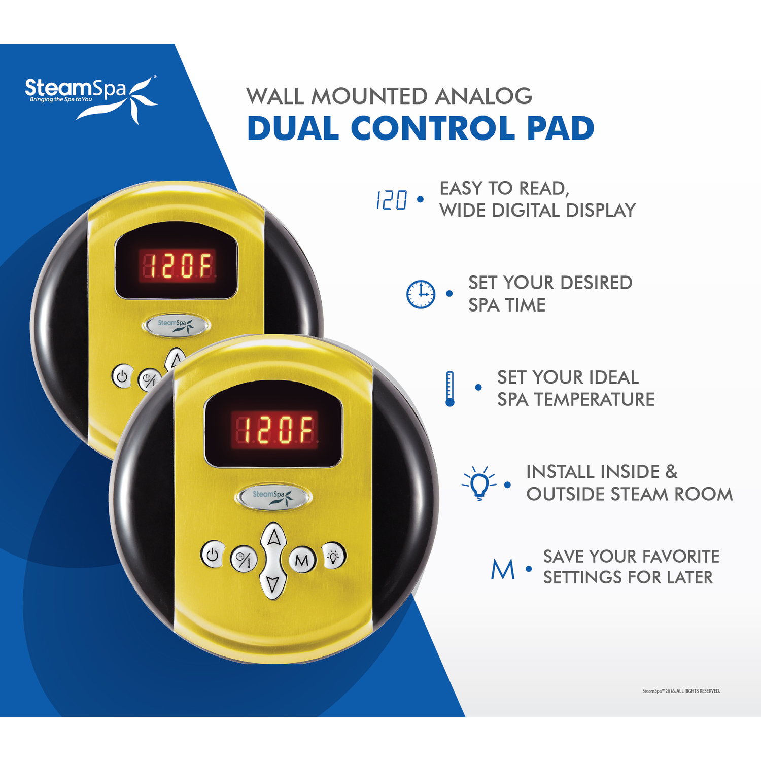 The perfect steam sauna experience is exactly what we had in mind with SteamSpa steam generator packages. Easy to install and even easier to operate these steam generators produce a consistent flow of soft and soothing steam thanks to the cleverly designed dual tank technology while minimizing any distracting operational noises. Compact in size and design they also feature the Auto Drain system that aids in making maintenance easier by purging the generator of any excess water/minerals that would later contribute to issues down the line. All in all you get a safe, quite, reliable, luxurious steam sauna experience with our compact powerhouse of a steam generator.For more information please call 1-800-856-0172Includes a 4.5kW QuickStart Acu-Steam Bath Generator, Dual Control Panel, Steamhead, Chromatherapy Light, Filter, Pressure Relief Valve, Built in Auto Drain, Plumber Ready Quick Connection Kit, and FREE Bottle of Aroma Scented OilQuickStart technology allows steam generation in about a minuteWhisper quiet operationContinuous uninterrupted steam flowMaximum volume rating: 128 cu ft.Power: 4.5kW, 240V, 25AGold FinishControl Panel System operates all generator functionsAromatherapy releases soothing fragrances through the mist surrounding you with your favorite aromatic scentChromatherapy three color mode LED light will create a soothing, therapeutic environment in bath and shower roomsWater Filter reduces rust, contaminants and other debris from entering the system which helps prolong the life of the steam generator.Built in auto drain purges the generator after each steam bath substantially reducing the chance of mineral, and rust build-up, prolonging the generator's operating life.Ships from manufacturer within 24 hours