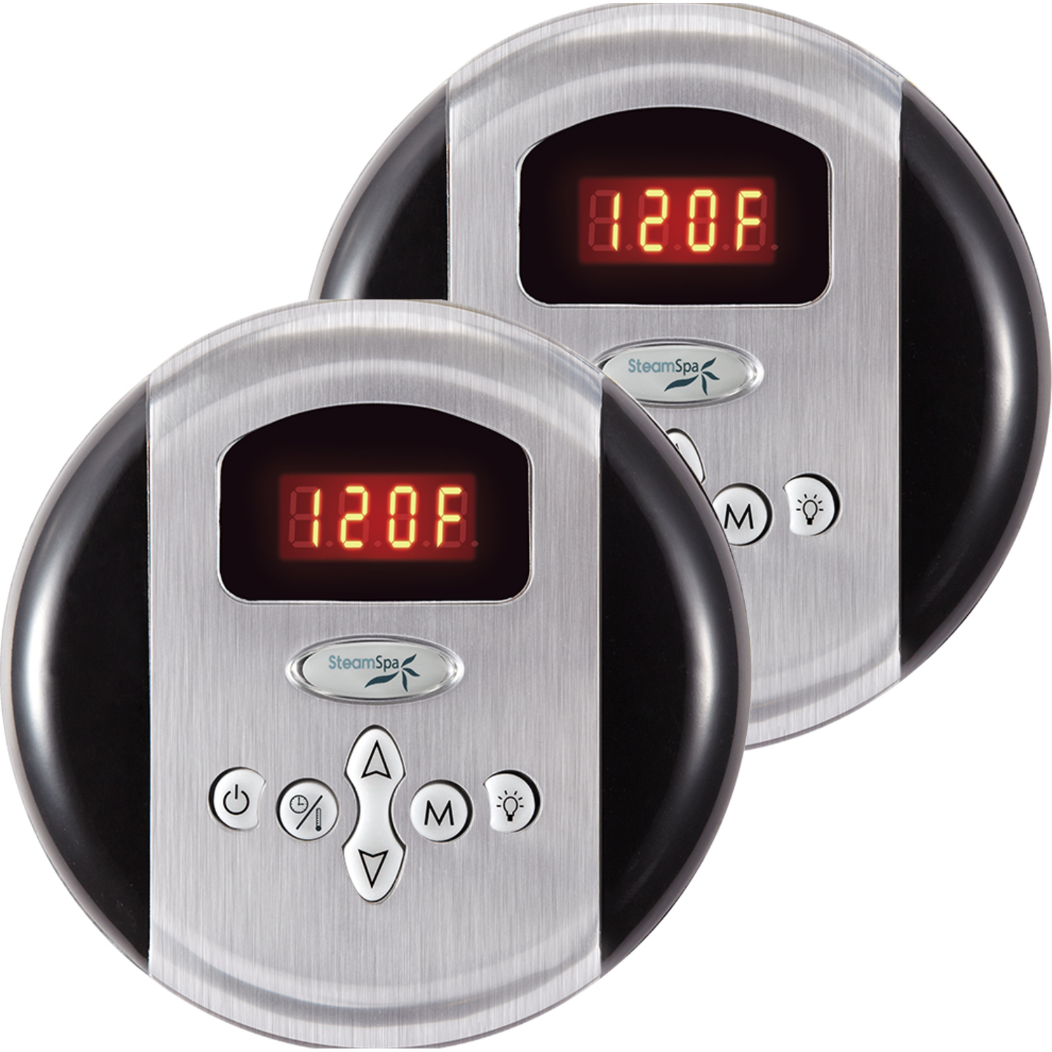 The dual control panels are the ideal input devices for any SteamSpa steam generator. With a large LCD displays and a simple to use interface these control panels allow access to room temperature controls and time setting options for your generator. Also featured are memory banks to store your settings for future use. With their stylish design this pair will match with most any bathroom style or décor adding to the luxurious sauna atmosphere. This dual panel system allows for even more flexibility with installation setups including having a panel on the inside and outside of your sauna enclosure. Take control of your ideal sauna experience with our dual control panels and create the steam sauna experience that’s perfect for you.For more information please call 1-800-856-0172Includes: Two Control PanelsBrushed Nickel finishControl panel with time and temperature controls and memoryProgrammable temperature control and 60 minute time cycleDigital readout display and soft touch keypad. On/Off and Pause modesBuilt in temperature probe gauges the showers temperature for added comfortCompatible with SteamSpa steam generatorsInside/outside the enclosure installationShips from manufacturer within 24 hours