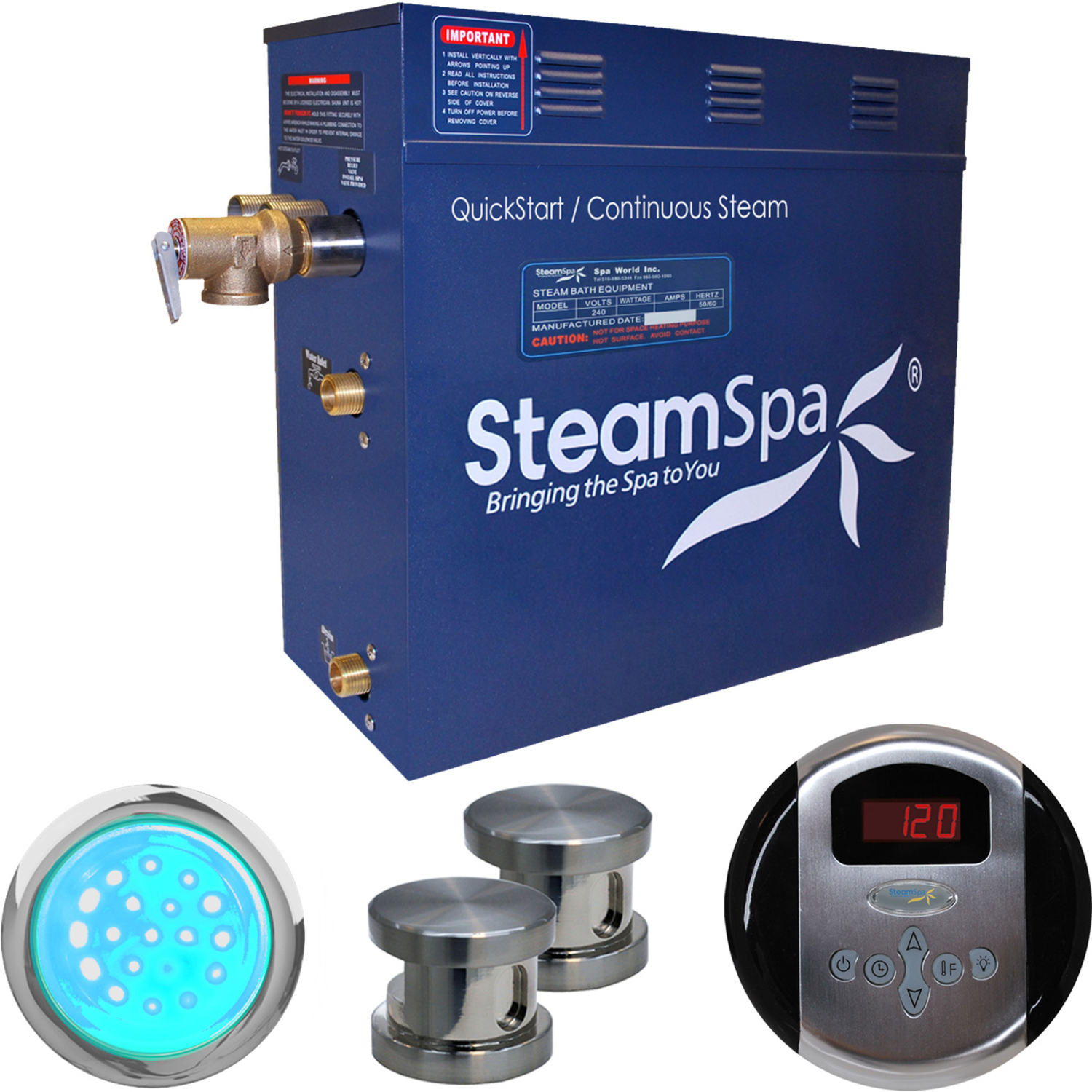 The perfect steam sauna experience is exactly what we had in mind with SteamSpa steam generator packages. Easy to install and even easier to operate these steam generators produce a consistent flow of soft and soothing steam thanks to the cleverly designed dual tank technology while minimizing any distracting operational noises. All in all you get a safe, quite, reliable, luxurious steam sauna experience with our compact powerhouse of a steam generator.For more information please call 1-800-856-0172Includes a 10.5kW QuickStart Acu-Steam Bath Generator, Control Panel, Two Steamheads, Chromatherapy Light, Pressure Relief Valve, and FREE Bottle of Aroma Scented OilQuickStart technology allows steam generation in about a minuteWhisper quiet operationContinuous uninterrupted steam flowMaximum volume rating: 420 cu ft.Power: 10.5kW, 240V, 44ABrushed Nickel finishIntegrated aroma steamhead reservoir for a scented steam experienceAromatherapy releases soothing fragrances through the mist surrounding you with your favorite aromatic scentChromatherapy three color mode LED light will create a soothing, therapeutic environment in bath and shower roomsShips from manufacturer within 24 hoursWe highly recommend the Complete Essential Installation Kit for proper unit installation. Ask or search for SKU number STMKIT for more information and pricing.