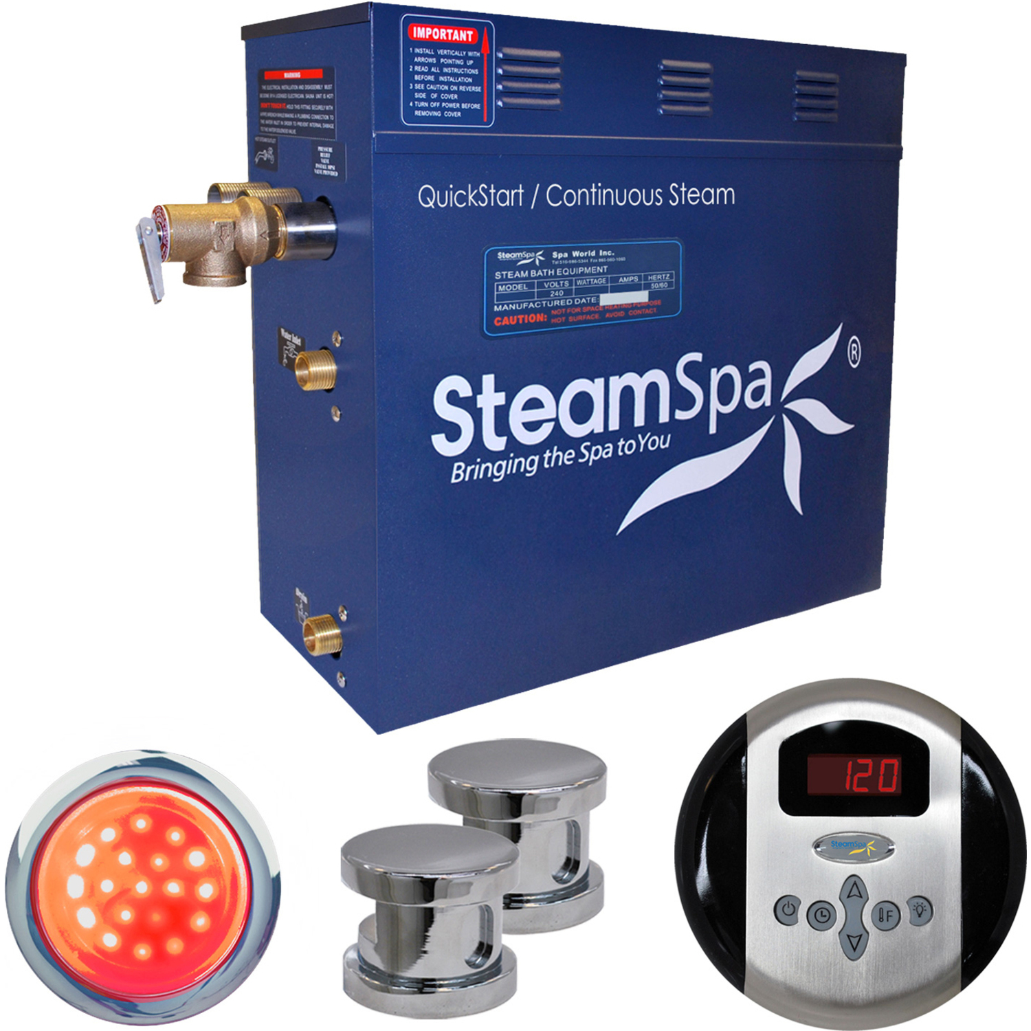 The perfect steam sauna experience is exactly what we had in mind with SteamSpa steam generator packages. Easy to install and even easier to operate these steam generators produce a consistent flow of soft and soothing steam thanks to the cleverly designed dual tank technology while minimizing any distracting operational noises. All in all you get a safe, quite, reliable, luxurious steam sauna experience with our compact powerhouse of a steam generator.For more information please call 1-800-856-0172Includes a 10.5kW QuickStart Acu-Steam Bath Generator, Control Panel, Two Steamheads, Chromatherapy Light, Pressure Relief Valve, and FREE Bottle of Aroma Scented OilQuickStart technology allows steam generation in about a minuteWhisper quiet operationContinuous uninterrupted steam flowMaximum volume rating: 420 cu ft.Power: 10.5kW, 240V, 44APolished Chrome finishIntegrated aroma steamhead reservoir for a scented steam experienceAromatherapy releases soothing fragrances through the mist surrounding you with your favorite aromatic scentChromatherapy three color mode LED light will create a soothing, therapeutic environment in bath and shower roomsShips from manufacturer within 24 hoursWe highly recommend the Complete Essential Installation Kit for proper unit installation. Ask or search for SKU number STMKIT for more information and pricing.
