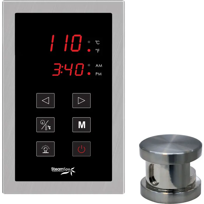 The control panel is the primary input device for any SteamSpa steam generator. With a large LCD display and simple to use interface the control panel allows access to room temperature controls and time setting options for your generator. With a stylish design it will match with most any bathroom style or décor adding to an overall luxurious sauna atmosphere. Take control of your ideal sauna experience with this stylish control panel and create the steam sauna experience that’s perfect for you.For more information please call 1-800-856-0172Includes a Single Touch Pad Control Panel and SteamheadPolished Brushed Nickel finishTouch Panel Control System operates all generator functionsFeatures programmable time and temperature memory settingsCelsius and Fahrenheit availableTemperature and clock functions on an easy to read large display screenIntegrated aroma steamhead reservoir for a scented steam experience. Add a few drops of your favorite fragrance and enjoy a refreshing, stimulating aroma therapy.Aromatherapy releases soothing fragrances through the mist surrounding you with your favorite aromatic scentShips from manufacturer within 24 hours