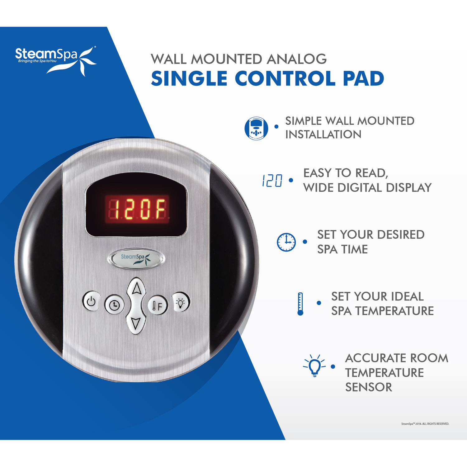 The perfect steam sauna experience is exactly what we had in mind with SteamSpa steam generator packages. Easy to install and even easier to operate these steam generators produce a consistent flow of soft and soothing steam thanks to the cleverly designed dual tank technology while minimizing any distracting operational noises. Compact in size and design they also feature the Auto Drain system that aids in making maintenance easier by purging the generator of any excess water/minerals that would later contribute to issues down the line. All in all you get a safe, quite, reliable, luxurious steam sauna experience with our compact powerhouse of a steam generator.For more information please call 1-800-856-0173Includes a 10.5kW QuickStart Acu-Steam Bath Generator, Control Panel, Two Steamheads, Pressure Relief Valve, Built in Auto Drain, and Plumber Ready Quick Connection Kit.QuickStart technology allows steam generation in about a minuteWhisper quiet operationContinuous uninterrupted steam flowMaximum volume rating: 420 cu ft.Power: 10.5kW, 240V, 44ABrushed Nickel finishControl panel System operates all generator functionsBuilt in auto drain purges the generator after each steam bath substantially reducing the chance of mineral, and rust build-up, prolonging the generator's operating life.Aromatherapy releases soothing fragrances through the mist surrounding you with your favorite aromatic scentShips from manufacturer within 24 hoursWe highly recommend the Complete Essential Installation Kit for proper unit installation. Ask or search for SKU number STMKIT for more information and pricing.