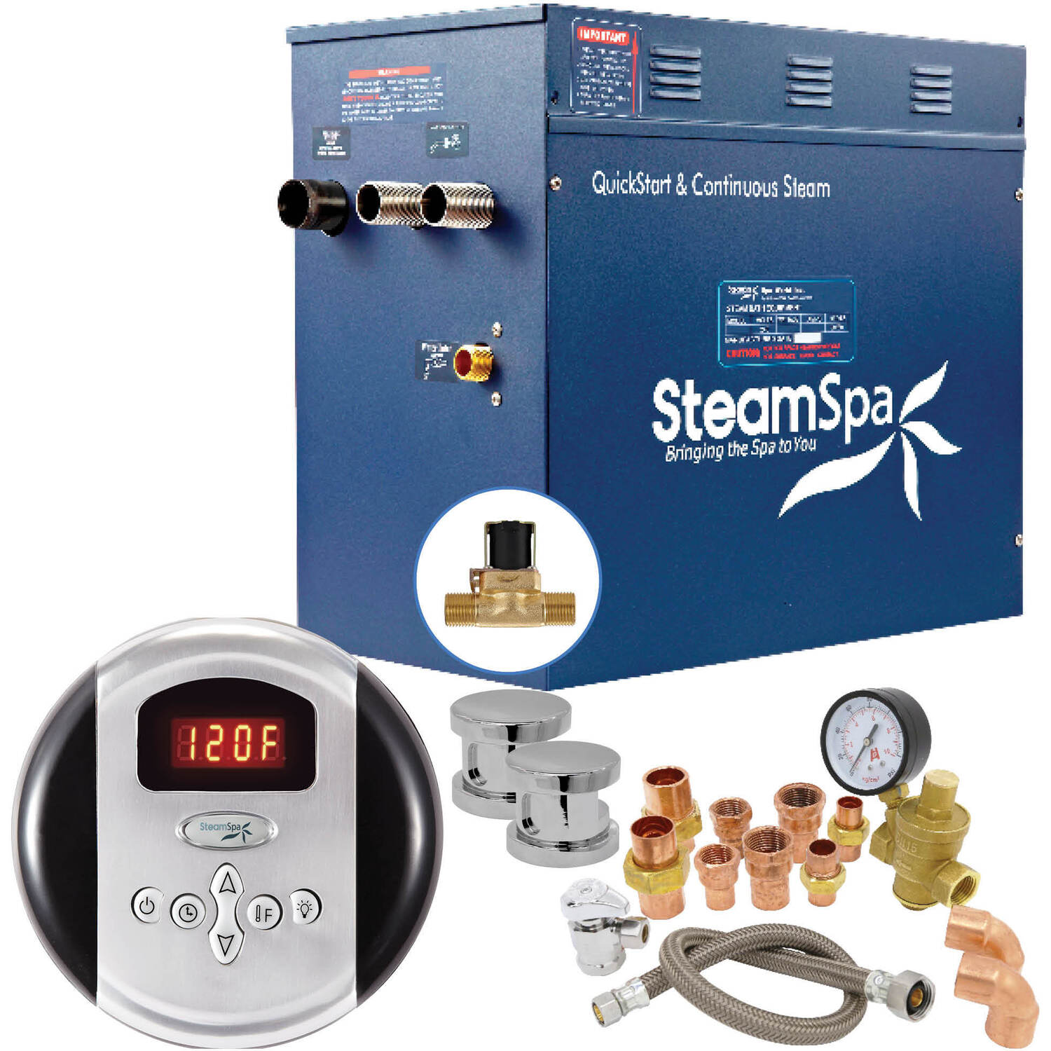 The perfect steam sauna experience is exactly what we had in mind with SteamSpa steam generator packages. Easy to install and even easier to operate these steam generators produce a consistent flow of soft and soothing steam thanks to the cleverly designed dual tank technology while minimizing any distracting operational noises. Compact in size and design they also feature the Auto Drain system that aids in making maintenance easier by purging the generator of any excess water/minerals that would later contribute to issues down the line. All in all you get a safe, quite, reliable, luxurious steam sauna experience with our compact powerhouse of a steam generator.For more information please call 1-800-856-0173Includes a 10.5kW QuickStart Acu-Steam Bath Generator, Control Panel, Two Steamheads, Pressure Relief Valve, Built in Auto Drain, and Plumber Ready Quick Connection Kit.QuickStart technology allows steam generation in about a minuteWhisper quiet operationContinuous uninterrupted steam flowMaximum volume rating: 420 cu ft.Power: 10.5kW, 240V, 44APolished Chrome finishControl panel System operates all generator functionsBuilt in auto drain purges the generator after each steam bath substantially reducing the chance of mineral, and rust build-up, prolonging the generator's operating life.Aromatherapy releases soothing fragrances through the mist surrounding you with your favorite aromatic scentShips from manufacturer within 24 hoursWe highly recommend the Complete Essential Installation Kit for proper unit installation. Ask or search for SKU number STMKIT for more information and pricing.
