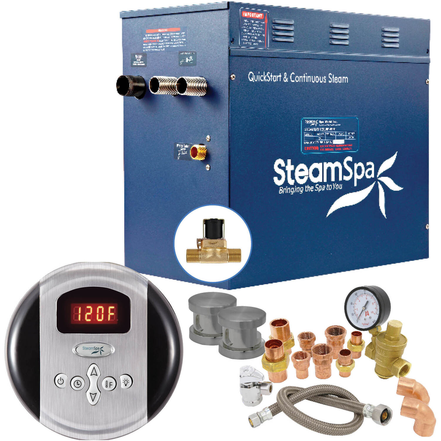 The perfect steam sauna experience is exactly what we had in mind with SteamSpa steam generator packages. Easy to install and even easier to operate these steam generators produce a consistent flow of soft and soothing steam thanks to the cleverly designed dual tank technology while minimizing any distracting operational noises. Compact in size and design they also feature the Auto Drain system that aids in making maintenance easier by purging the generator of any excess water/minerals that would later contribute to issues down the line. All in all you get a safe, quite, reliable, luxurious steam sauna experience with our compact powerhouse of a steam generator.For more information please call 1-800-856-0173Includes a 12kW QuickStart Acu-Steam Bath Generator, Control Panel, Two Steamheads, Pressure Relief Valve, Built in Auto Drain, and Plumber Ready Quick Connection Kit.QuickStart technology allows steam generation in about a minuteWhisper quiet operationContinuous uninterrupted steam flowMaximum volume rating: 430 cu ft.Power: 12kW, 240V, 50ABrushed Nickel finishControl panel System operates all generator functionsBuilt in auto drain purges the generator after each steam bath substantially reducing the chance of mineral, and rust build-up, prolonging the generator's operating life.Aromatherapy releases soothing fragrances through the mist surrounding you with your favorite aromatic scentShips from manufacturer within 24 hoursWe highly recommend the Complete Essential Installation Kit for proper unit installation. Ask or search for SKU number STMKIT for more information and pricing.