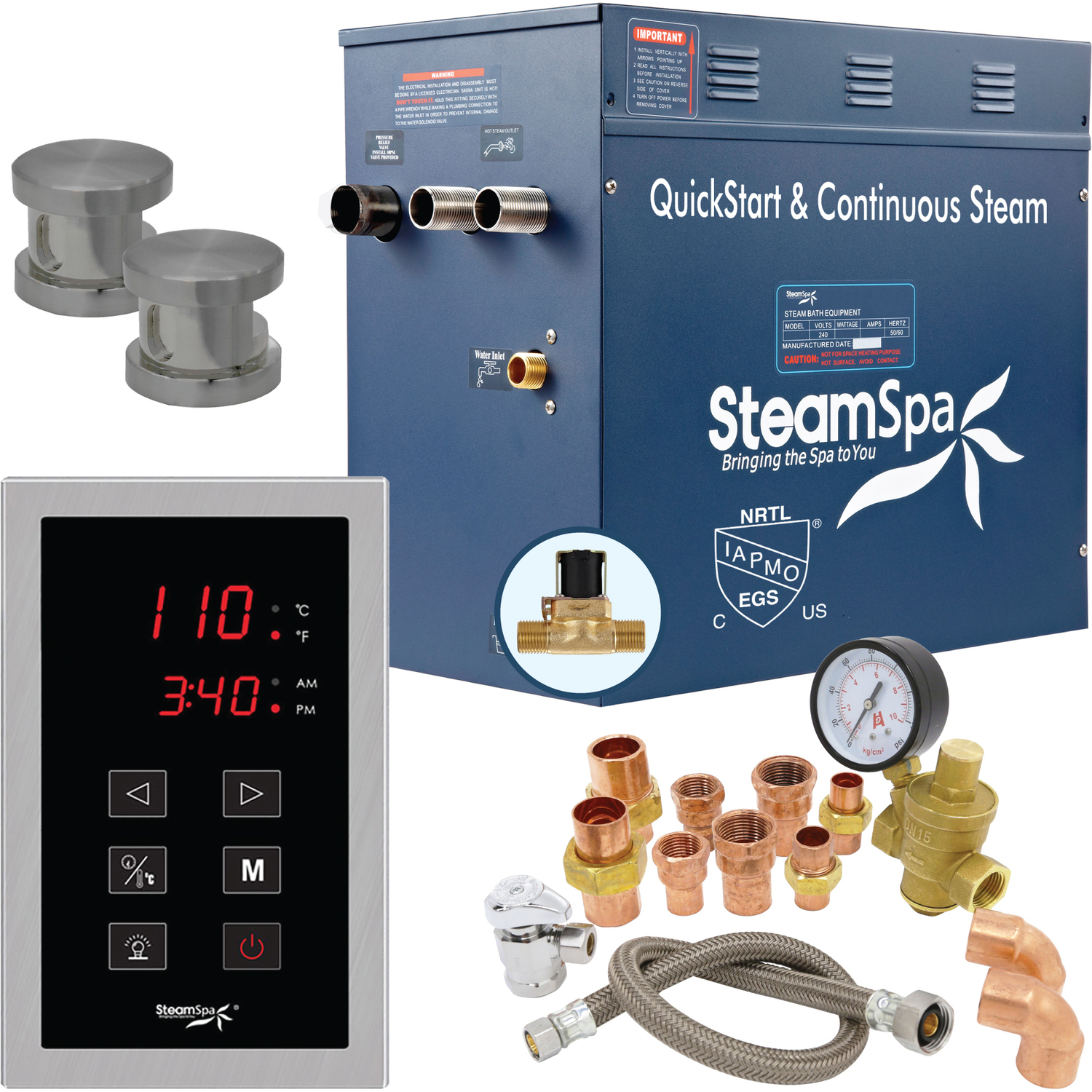 The perfect steam sauna experience is exactly what we had in mind with SteamSpa steam generator packages. Easy to install and even easier to operate these steam generators produce a consistent flow of soft and soothing steam thanks to the cleverly designed dual tank technology while minimizing any distracting operational noises. Compact in size and design they also feature the Auto Drain system that aids in making maintenance easier by purging the generator of any excess water/minerals that would later contribute to issues down the line. All in all you get a safe, quite, reliable, luxurious steam sauna experience with our compact powerhouse of a steam generator.For more information please call 1-800-856-0172Includes a 12kW QuickStart Acu-Steam Bath Generator, Touch Pad Control Panel, Two Steamheads, Pressure Relief Valve, Built in Auto Drain, Plumber Ready Quick Connection Kit, and FREE Bottle of Aroma Scented OilQuickStart technology allows steam generation in about a minuteWhisper quiet operationContinuous uninterrupted steam flowMaximum volume rating: 430 cu ft.Power: 12kW, 240V, 50APolished Brushed Nickel finishTouch Panel Control System operates all generator functionsBuilt in auto drain purges the generator after each steam bath substantially reducing the chance of mineral, and rust build-up, prolonging the generator's operating life.Aromatherapy releases soothing fragrances through the mist surrounding you with your favorite aromatic scentShips from manufacturer within 24 hoursWe highly recommend the Complete Essential Installation Kit for proper unit installation. Ask or search for SKU number STMKIT for more information and pricing.