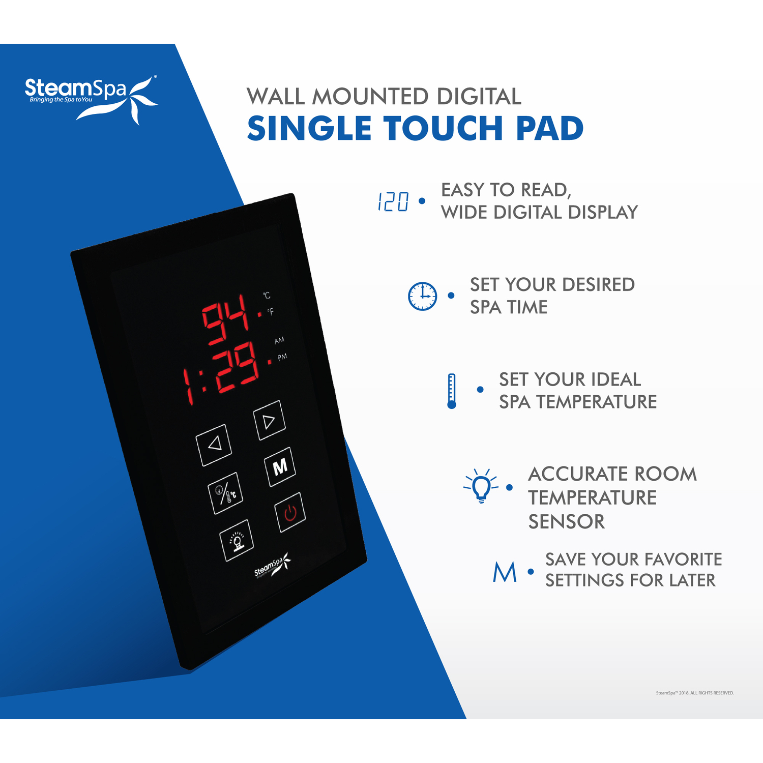 The perfect steam sauna experience is exactly what we had in mind with SteamSpa steam generator packages. Easy to install and even easier to operate these steam generators produce a consistent flow of soft and soothing steam thanks to the cleverly designed dual tank technology while minimizing any distracting operational noises. Compact in size and design they also feature the Auto Drain system that aids in making maintenance easier by purging the generator of any excess water/minerals that would later contribute to issues down the line. All in all you get a safe, quite, reliable, luxurious steam sauna experience with our compact powerhouse of a steam generator.For more information please call 1-800-856-0172Includes a 4.5kW QuickStart Acu-Steam Bath Generator, Touch Pad Control Panel, Steamhead, Built in Auto Drain, Plumber Ready Quick Connection Kit, and FREE Bottle of Aroma Scented OilQuickStart technology allows steam generation in about a minuteWhisper quiet operationContinuous uninterrupted steam flowMaximum volume rating: 75 cu ft.Power: 4.5kW, 240V, 19AMatte Black finishTouch Panel Control System operates all generator functionsAromatherapy releases soothing fragrances through the mist surrounding you with your favorite aromatic scentFeatures programmable time and temperature memory settingsBuilt in auto drain purges the generator after each steam bathShips from manufacturer within 24 hoursWe highly recommend the Complete Essential Installation Kit for proper unit installation. Ask or search for SKU number STMKIT for more information and pricing.