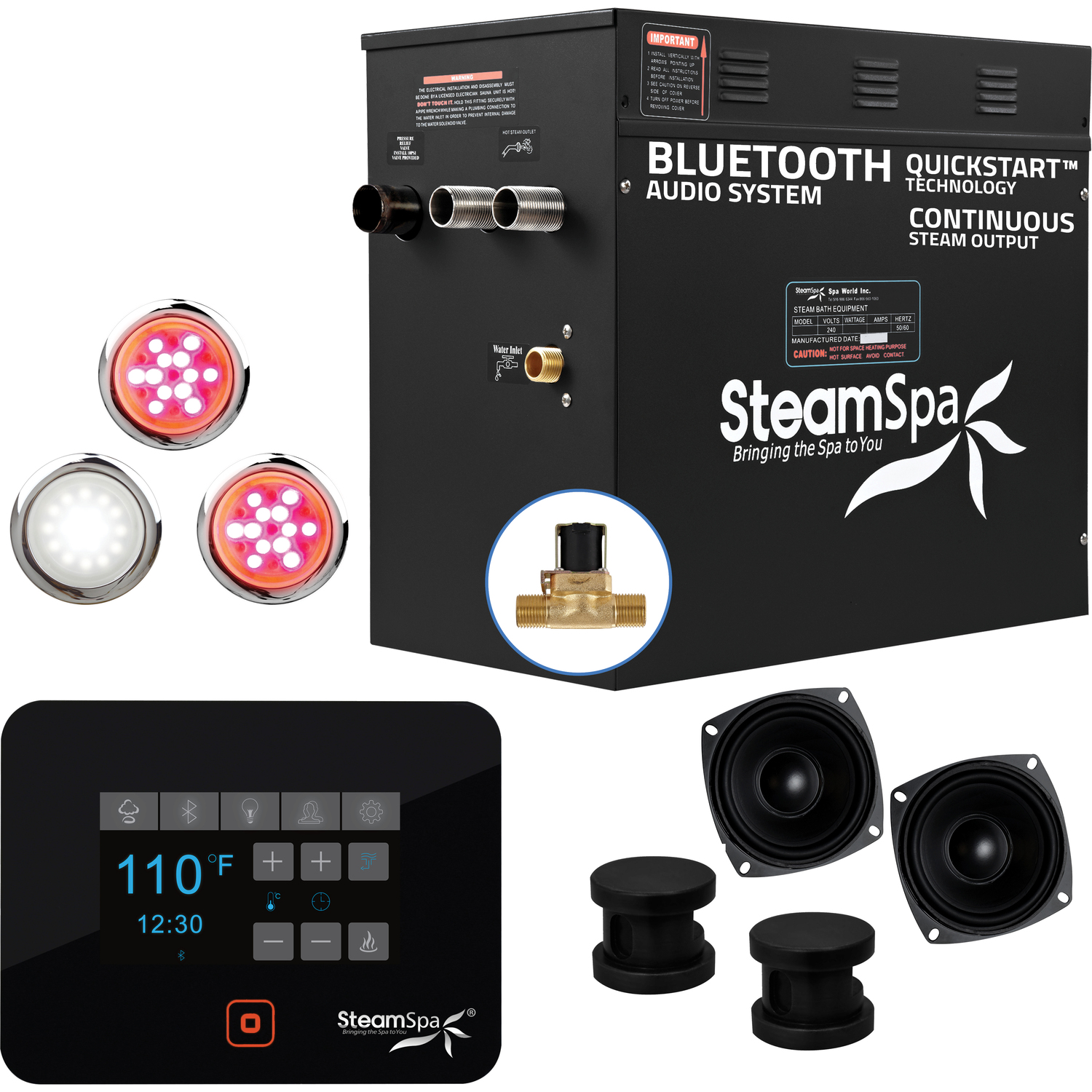 SteamSpa BLUETOOTH RAVEN SERIES delivers total control over your steam spa bath experience right at your fingertips. This new sleek, modern, console features a backlit touch screen display with intuitive controls and Bluetooth connectivity so you can listen to your favorite music, radio, podcasts and more. Set your steam to the perfect temperature and begin enjoying the deeply soothing sensation of the ideal sauna spa experience. SteamSpa Chromatherapy color lights set the mood and bask in the rejuvenative power of chroma light bathing. Once the bath is done the system will automatically dispel any remaining water thanks to the built-in auto drain system. This helps prevent mineral deposit build-up and keeps your generator health and running for longer. All in all, you get a safe, quiet, reliable, luxurious steam sauna experience with our compact powerhouse of a steam generator.For more information please call 1-800-856-0173Package includes: QuickStart 12kW Steam Bath Generator, SteamSpa BLUETOOTH BLACK SERIES control, two Matte Black steamheads, pressure relief valve, dual steam bath speakers, white LED light, two chromatherapy color lights, and FREE aromatherapy scented oil bottleQUICKSTART - QuickStart technology allows steam generation in about 2-minutesCONTINUOUS STEAM - Continuous uninterrupted steam flowTOUCH SCREEN - Responsive touch screen with crystal clear display and intuitive controlsBLUETOOTH - Pairs with any bluetooth audio device to play your favorite music, podcast, audio book or radio station.SPEAKERS - Dual water proof audio speakers with clear sound qualityMEMORY - Save up to 6 steam bath custom time and temperature profiles.DAILY TIMER - Schedule your steam bath to automatically startup and begin producing steam so it's ready when you are.CHROMA BATH LIGHTS - Chromatherapy LED light will create a soothing, therapeutic environment in bath and shower roomsAUTODRAIN - Built in auto drain purges the generator after each steam bathLED WHITE LIGHT - Illuminate you steam bath with an energy efficient LED powered lightSTEAMHEAD - Solid steel steamhead with aroma oils reservoir in Matte Black.AROMA STEAM BATH - Aromatherapy releases soothing fragrances through the mist surrounding you with your favorite aromatic scent.