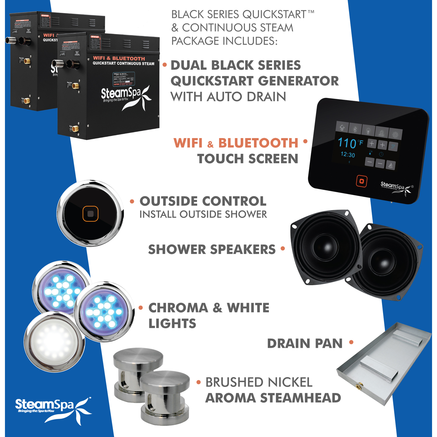 SteamSpa WIFI and BLUETOOTH deliver total control over your steam spa bath experience right from your phone. Set your steam to the perfect temperature and begin enjoying the deeply soothing sensation of the ideal sauna spa experience. Then envolope yourself in your favor aroma therapy scented 100% natural essence with the Dual Bottle Aroma Pump. Once the bath is done the system will automatically dispel any remaining water thanks to the built-in auto drain system. This helps prevent mineral deposit build-up and keeps your generator healthy and running for longer.For more information please call 1-800-856-0172Package includes: 2x QuickStart 7.5kW Steam Bath Generator, WIFI reciever box, BLUETOOTH control panel, two brushed nickel steamhead, pressure relief valve, dual steam bath speakers, white LED light, two chromatherapy color lights, two drain pans, and FREE aromatherapy scented oil bottleWe highly recommend the Complete Essential Installation Kit for proper unit installation. Ask or search for SKU number STMKIT for more information and pricing.QUICKSTART - QuickStart technology allows steam generation in about 2-minutesCONTINUOUS STEAM - Continuous uninterrupted steam flowQUIET - Whisper quiet operationWIFI - Take full control of your steam shower from anywhere using our new wifi app.TOUCH SCREEN - Responsive touch screen with crystal clear display and intuitive controlsBLUETOOTH - Pairs with any bluetooth audio device to play your favorite music, podcast, audio book or radio station.MEMORY - Save up to 6 steam bath custom time and temperature profiles.SPEAKERS - Dual water proof audio speakers with clear sound qualityDAILY TIMER - Schedule your steam bath to automatically startup and begin producing steam so it's ready when you are.AUTODRAIN - Built in auto drain purges the generator after each steam bathCHROMA BATH LIGHTS - Chromatherapy LED light will create a soothing, therapeutic environment in bath and shower rooms