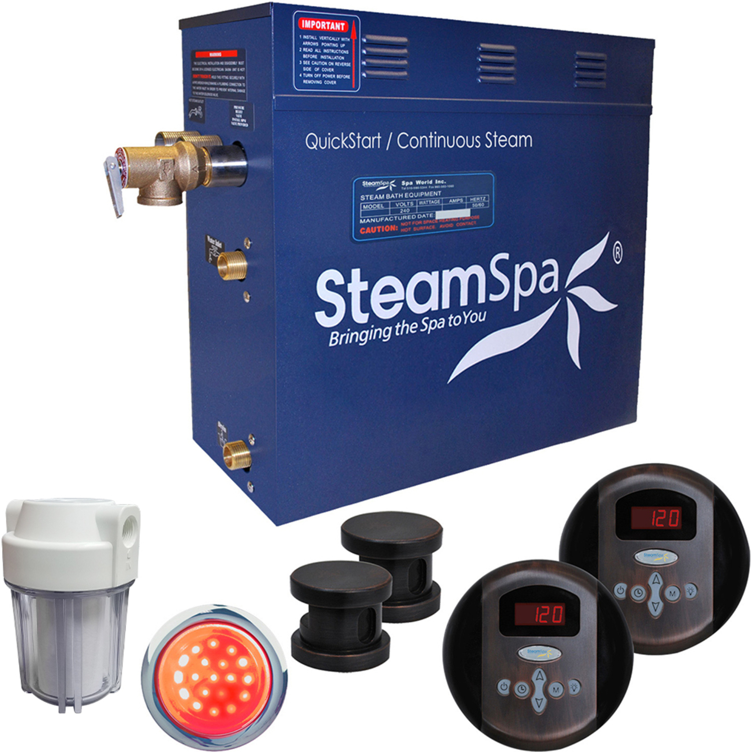 The perfect steam sauna experience is exactly what we had in mind with SteamSpa steam generator packages. Easy to install and even easier to operate these steam generators produce a consistent flow of soft and soothing steam thanks to the cleverly designed dual tank technology while minimizing any distracting operational noises. All in all you get a safe, quite, reliable, luxurious steam sauna experience with our compact powerhouse of a steam generator.For more information please call 1-800-856-0172Includes a 12kW QuickStart Acu-Steam Bath Generator, Dual Control Panel, Two Steamheads, Chromatherapy Light, Filter, Pressure Relief Valve, and FREE Bottle of Aroma Scented OilQuickStart technology allows steam generation in about a minuteWhisper quiet operationContinuous uninterrupted steam flowMaximum volume rating: 430 cu ft.Power: 12kW, 240V, 50AOil Rubbed Bronze finishIntegrated aroma steamhead reservoir for a scented steam experienceAromatherapy releases soothing fragrances through the mist surrounding you with your favorite aromatic scentChromatherapy three color mode LED light will create a soothing, therapeutic environment in bath and shower roomsWater Filter reduces rust, contaminants and other debris from entering the system which helps prolong the life of the steam generator.Ships from manufacturer within 24 hoursWe highly recommend the Complete Essential Installation Kit for proper unit installation. Ask or search for SKU number STMKIT for more information and pricing.