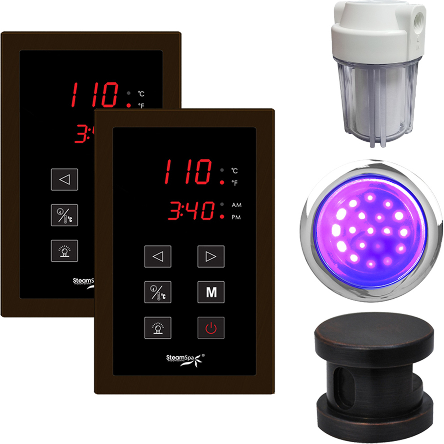 The control panel is the primary input device for any SteamSpa steam generator. With a large LCD display and simple to use interface the control panel allows access to room temperature controls and time setting options for your generator. With a stylish design it will match with most any bathroom style or décor adding to an overall luxurious sauna atmosphere. Take control of your ideal sauna experience with this stylish control panel and create the steam sauna experience that’s perfect for you.For more information please call 1-800-856-0172Includes a Dual Touch Pad Control Panel, Steamhead, Chromatherapy Light and FilterPolished Oil Rubbed Bronze finishTouch Panel Control System operates all generator functionsFeatures programmable time and temperature memory settingsCelsius and Fahrenheit availableTemperature and clock functions on an easy to read large display screenIntegrated aroma steamhead reservoir for a scented steam experience. Add a few drops of your favorite fragrance and enjoy a refreshing, stimulating aroma therapy.Chromatherapy three color mode LED light will create a soothing, therapeutic environment in bath and shower roomsWater Filter reduces rust, contaminants and other debris from entering the system which helps prolong the life of the steam generator.Aromatherapy releases soothing fragrances through the mist surrounding you with your favorite aromatic scentShips from manufacturer within 24 hours