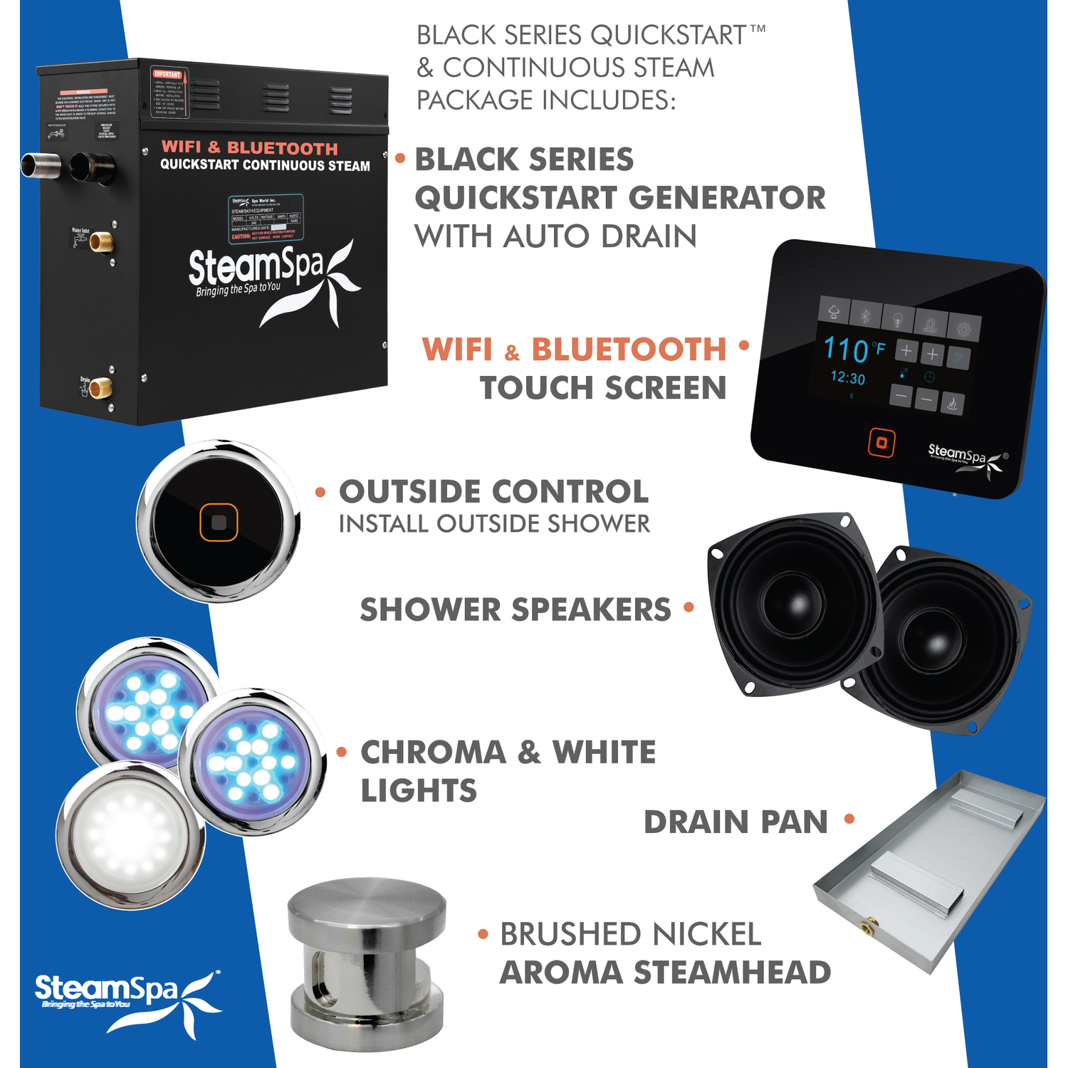 SteamSpa WIFI and BLUETOOTH deliver total control over your steam spa bath experience right from your phone. Set your steam to the perfect temperature and begin enjoying the deeply soothing sensation of the ideal sauna spa experience. Once the bath is done the system will automatically dispel any remaining water thanks to the built-in auto drain system. This helps prevent mineral deposit build-up and keeps your generator healthy and running for longer.For more information please call 1-800-856-0172Package includes: QuickStart 7.5kW Steam Bath Generator, WIFI reciever box, BLUETOOTH control panel, brushed nickel steamhead, pressure relief valve, dual steam bath speakers, white LED light, two chromatherapy color lights, drain pan, and FREE aromatherapy scented oil bottleWe highly recommend the Complete Essential Installation Kit for proper unit installation. Ask or search for SKU number STMKIT for more information and pricing.QUICKSTART - QuickStart technology allows steam generation in about a minuteCONTINUOUS STEAM - Continuous uninterrupted steam flowQUIET - Whisper quiet operationWIFI - Take full control of your steam shower from anywhere using our new wifi app.TOUCH SCREEN - Responsive touch screen with crystal clear display and intuitive controlsBLUETOOTH - Pairs with any bluetooth audio device to play your favorite music, podcast, audio book or radio station.MEMORY - Save up to 6 steam bath custom time and temperature profiles.SPEAKERS - Dual water proof audio speakers with clear sound qualityDAILY TIMER - Schedule your steam bath to automatically startup and begin producing steam so it's ready when you are.AUTODRAIN - Built in auto drain purges the generator after each steam bathCHROMA BATH LIGHTS - Chromatherapy LED light will create a soothing, therapeutic environment in bath and shower rooms