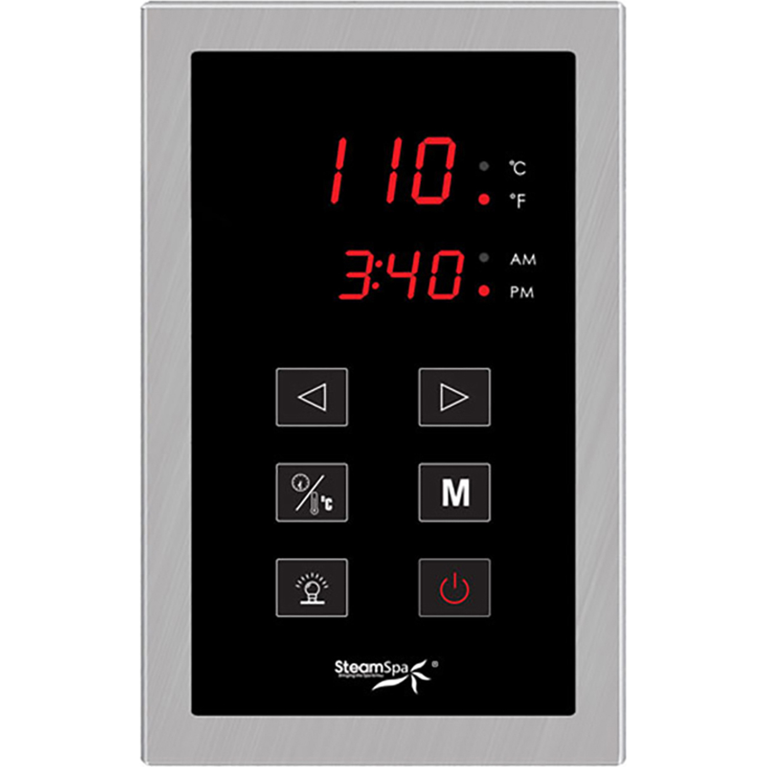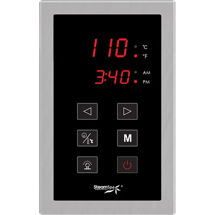 The control panel is the primary input device for any SteamSpa steam generator. With a large LCD display and simple to use interface the control panel allows access to room temperature controls and time setting options for your generator. With a stylish design it will match with most any bathroom style or décor adding to an overall luxurious sauna atmosphere. Take control of your ideal sauna experience with this stylish control panel and create the steam sauna experience that’s perfect for you.For more information please call 1-800-856-0172Polished Brushed Nickel finishTouch Panel Control System operates all generator functionsFeatures programmable time and temperature memory settingsCelsius and Fahrenheit availableTemperature and clock functions on an easy to read large display screenCompatible with any SteamSpa Generator Unit and lighting systemShips from manufacturer within 24 hours