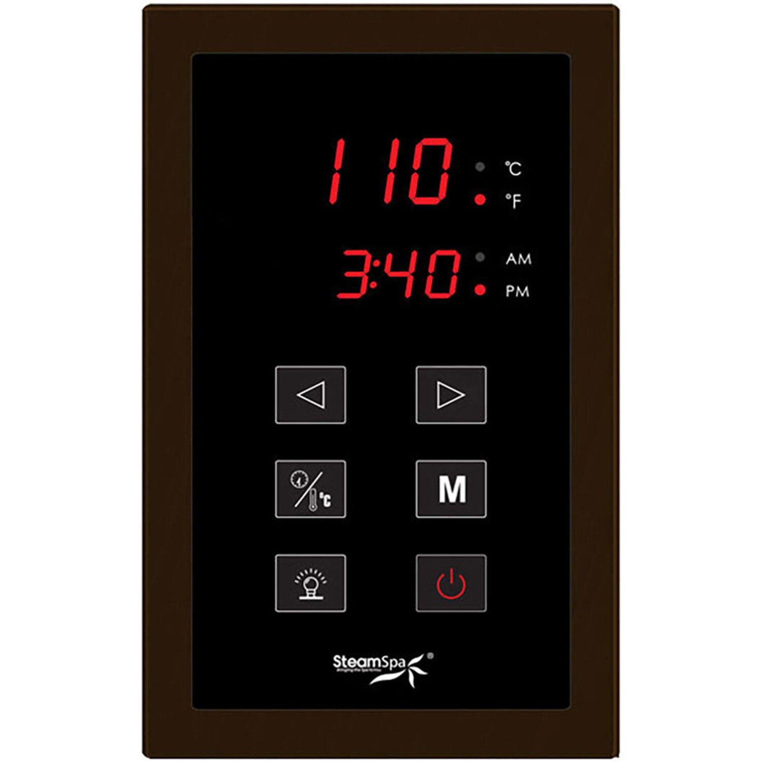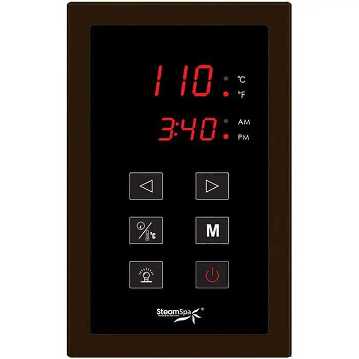 The control panel is the primary input device for any SteamSpa steam generator. With a large LCD display and simple to use interface the control panel allows access to room temperature controls and time setting options for your generator. With a stylish design it will match with most any bathroom style or décor adding to an overall luxurious sauna atmosphere. Take control of your ideal sauna experience with this stylish control panel and create the steam sauna experience that’s perfect for you.For more information please call 1-800-856-0172Polished Oil Rubbed Bronze finishTouch Panel Control System operates all generator functionsFeatures programmable time and temperature memory settingsCelsius and Fahrenheit availableTemperature and clock functions on an easy to read large display screenCompatible with any SteamSpa Generator Unit and lighting systemShips from manufacturer within 24 hours