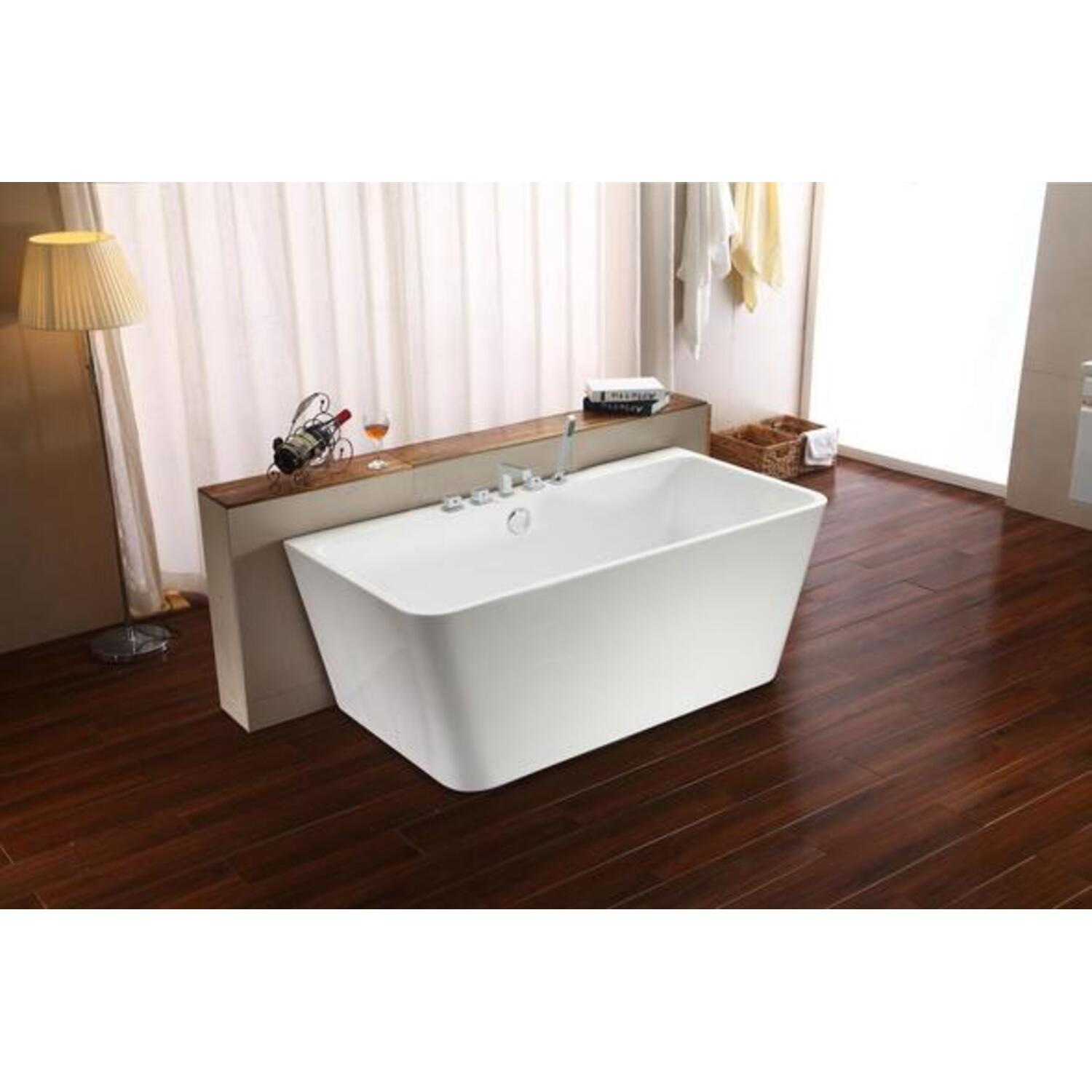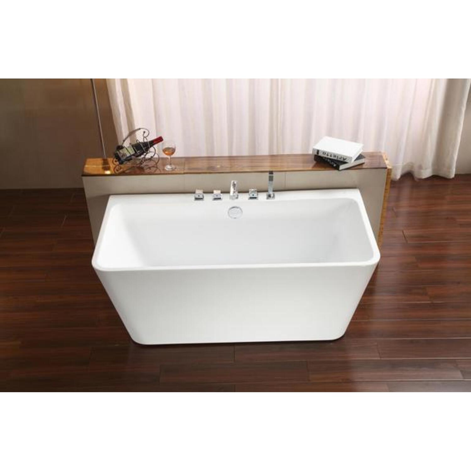 This modern Streamline 67" deep soaking bathtub with a polished chrome tub faucet, is designed with a beautiful white gloss finish and an internal drain to keep its sleek design. The tub comes with 5 pre-drilled holes for a deck mount faucet. This soft curved bathtub can hold up to 66 gallons of water.