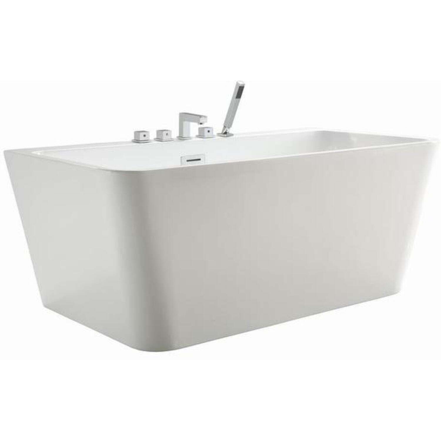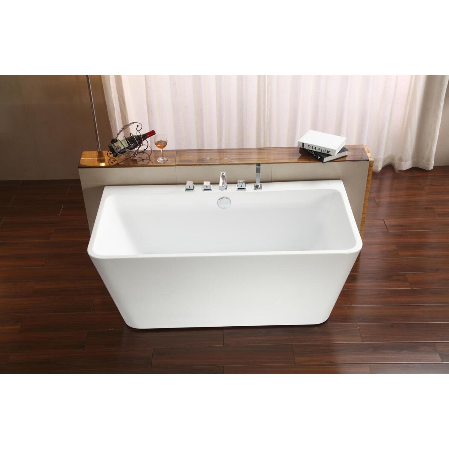 Simple and modern in design this Streamline 59" deep soaking bathtub can accentuate any bathroom. Designed with an internal drain and a white glossy exterior for a clean sleek look. The tub comes with 5 pre-drilled holes for a deck mount faucet. This bathtub can hold up to 60.8 gallons of water so you can take a relaxing bath.
