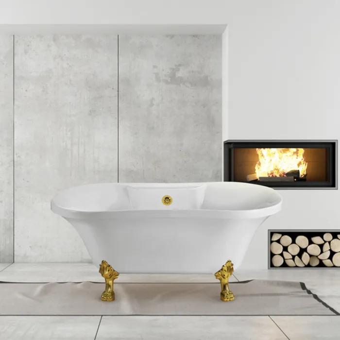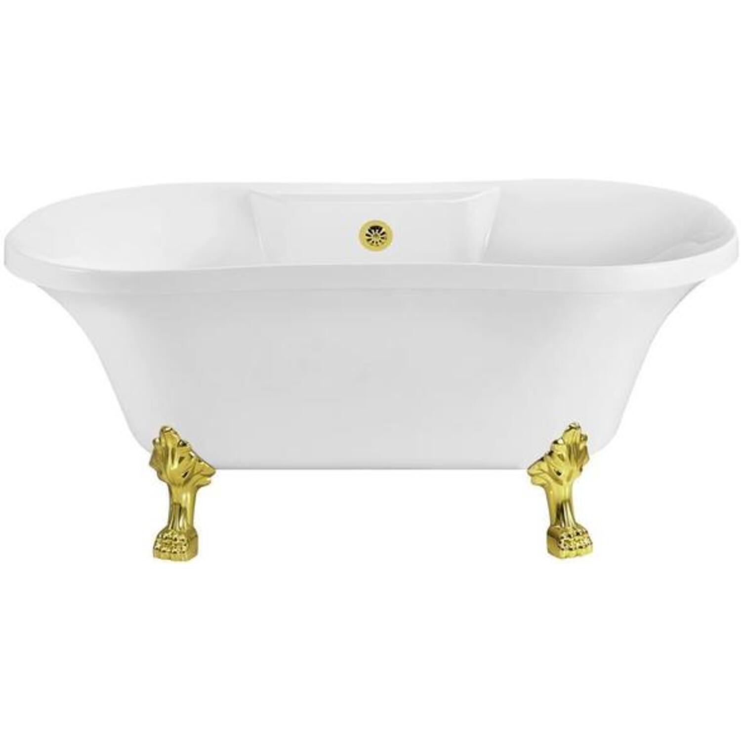 Soak in relaxation in this Streamline 60" vintage style clawfoot tub. It's white gloss exterior with gold claw feet will accentuate any bathroom. This timeless tub has a gold external drain and can hold up to 53 gallons of water.