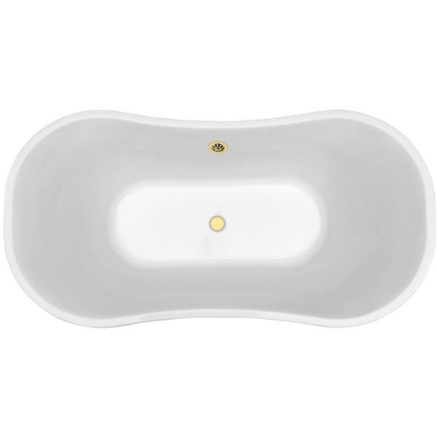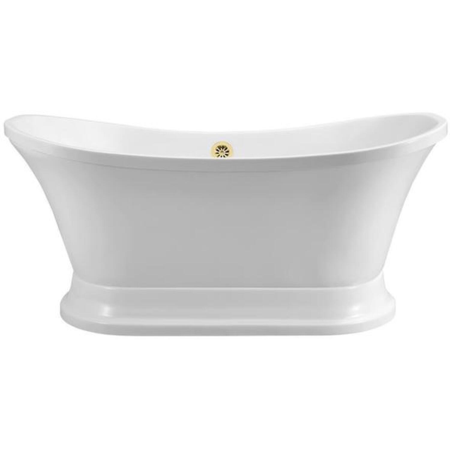 Add a touch of luxury to your bathroom with this double-slipper Streamline 60” white glossy bathtub. This modern style tub sits on a pedestal and has an external gold drain. You can enjoy your bath in a generous amount of water as this tub can hold up to 55 gallons of water.