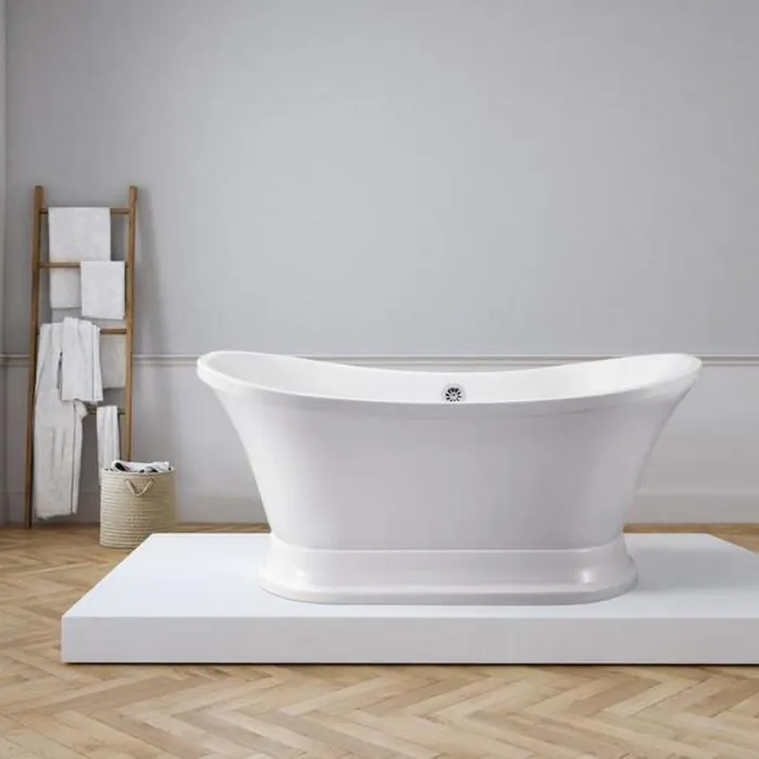 Add a touch of luxury to your bathroom with this double-slipper Streamline 68” white glossy bathtub. This modern style tub sits on a pedestal and has an external chrome drain. You can enjoy your bath in a generous amount of water as this tub can hold up to 67 gallons of water.