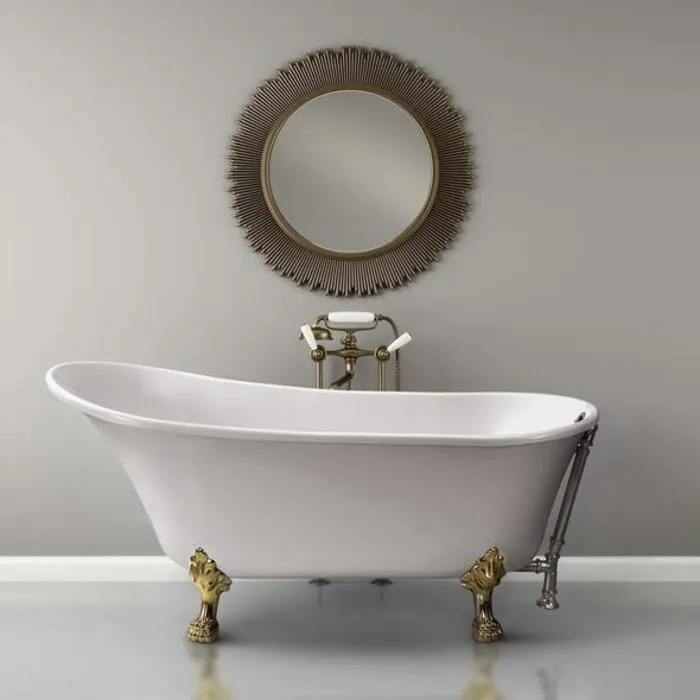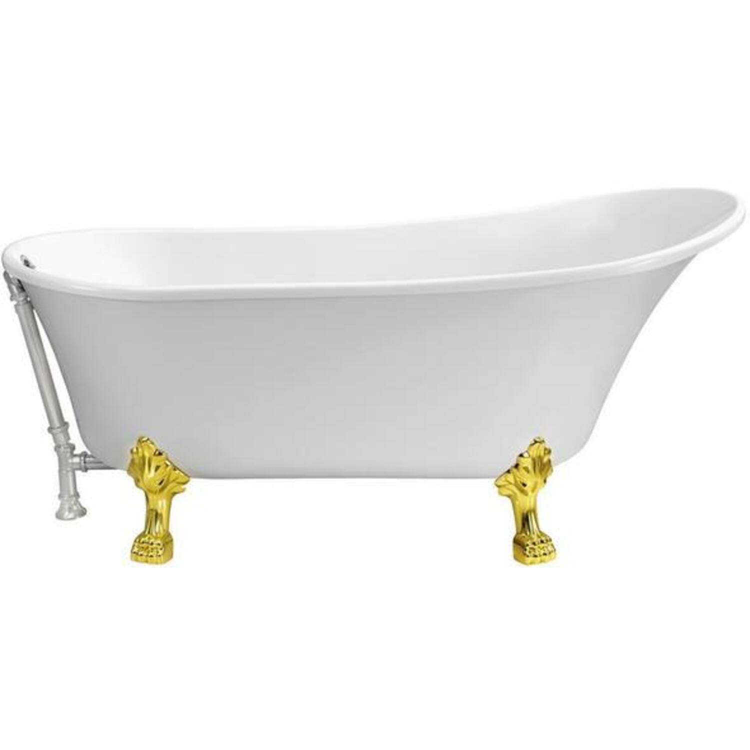 This Streamline vintage slipper style bathtub was designed to give your bathroom that classic timeless look. Its 59" glossy white exterior pairs up nicely with it’s detailed gold claw feet. The chrome exterior drain adds a finishing touch to that vintage look. You can submerge in a relaxing bath as this tub can hold up to 69 gallons of water.