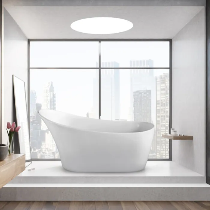 This Streamline 63" modern freestanding slipper tub can hold up to 63 gallons of water. It's sleek shape and glossy white finish will add a luxurious feel to any bathroom. This tub is designed with an internal drain to save space and keep it's sleek look.