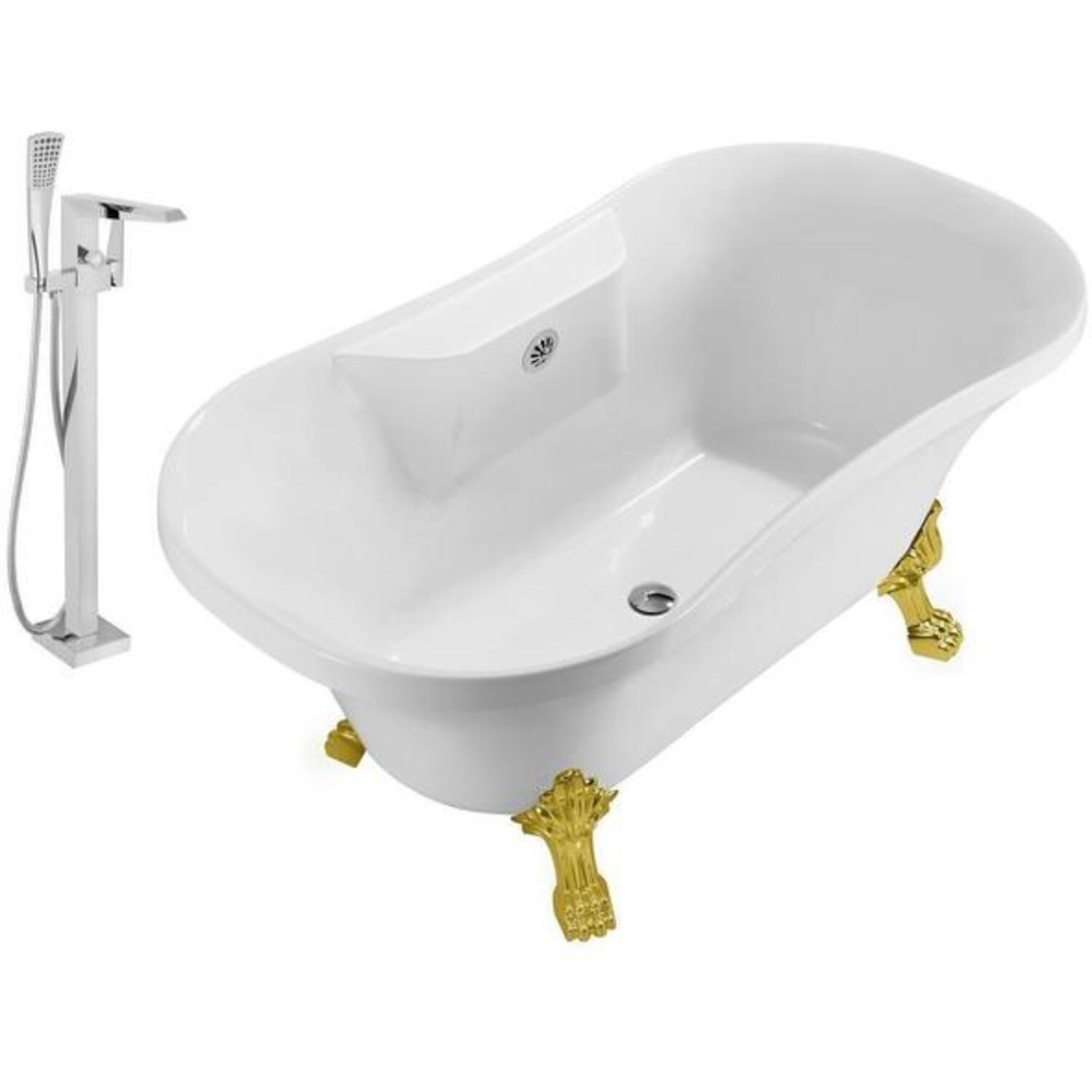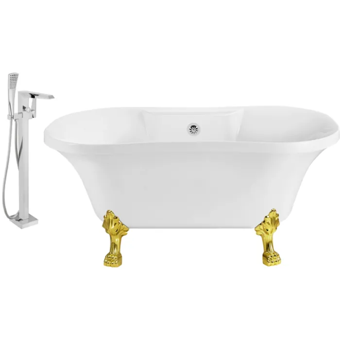 Soak in relaxation in this Streamline 60" vintage style clawfoot tub with a polished chrome tub faucet. Tub's white gloss exterior with gold claw feet will accentuate any bathroom. This timeless tub has a chrome external drain and can hold up to 53 gallons of water.