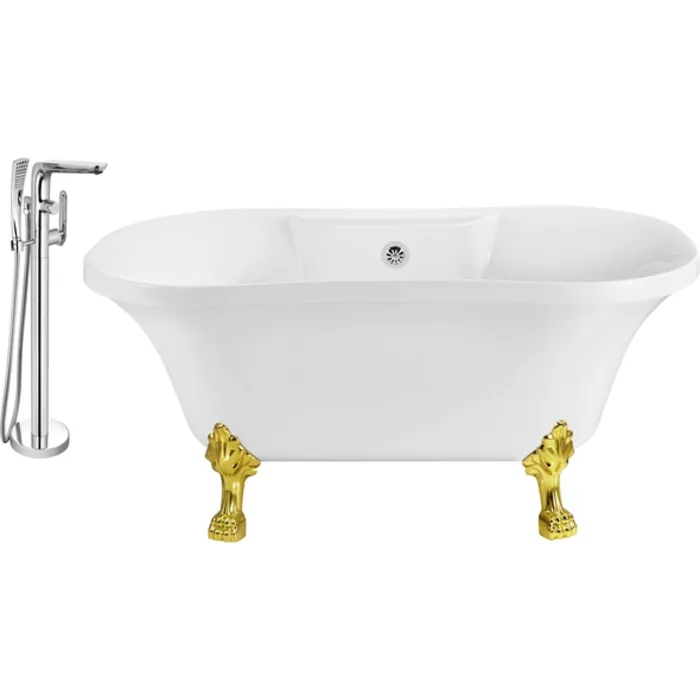 Soak in relaxation in this Streamline 60" vintage style clawfoot tub with a polished chrome tub faucet. Tub's white gloss exterior with gold claw feet will accentuate any bathroom. This timeless tub has a chrome external drain and can hold up to 53 gallons of water.