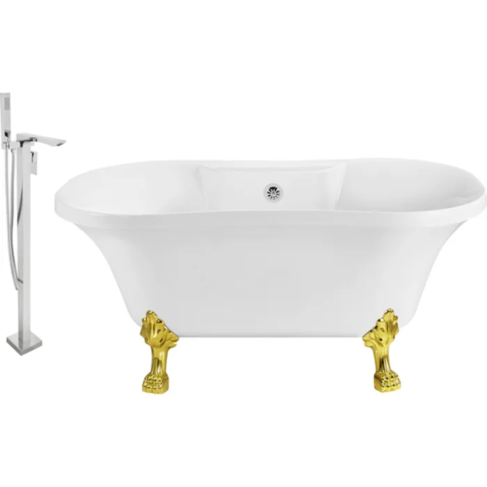 Soak in relaxation in this Streamline 60" vintage style clawfoot tub with a polished chrome tub faucet. Tub's white gloss exterior with gold claw feet will accentuate any bathroom. This timeless tub has a chrome external drain and can hold up to 53 gallons of water.