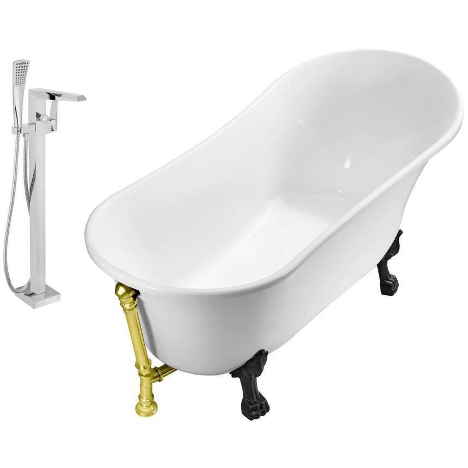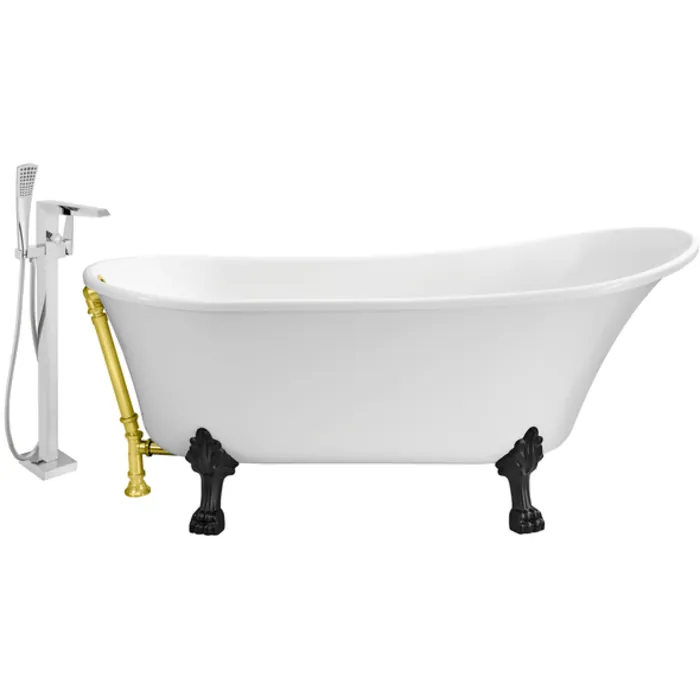 This Streamline vintage slipper style bathtub with a polished chrome tub faucet was designed to give your bathroom that classic timeless look. Tub's 67" glossy white exterior pairs up nicely with it’s detailed black claw feet. The gold exterior drain adds a finishing touch to that vintage look. You can submerge in a relaxing bath as this tub can hold up to 69 gallons of water.
