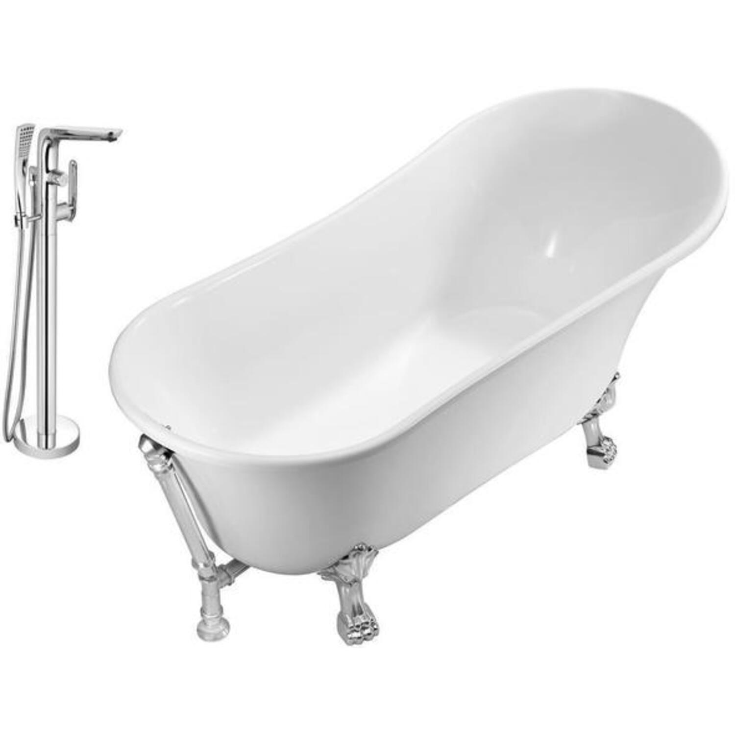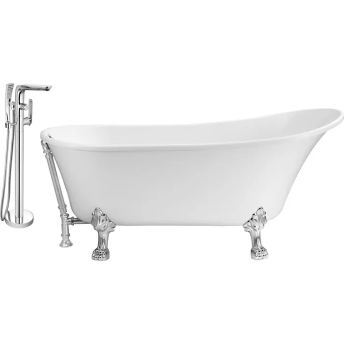 This Streamline vintage slipper style bathtub with a polished chrome tub faucet was designed to give your bathroom that classic timeless look. Tub's 67" glossy white exterior pairs up nicely with it’s detailed chrome claw feet. The chrome exterior drain adds a finishing touch to that vintage look. You can submerge in a relaxing bath as this tub can hold up to 69 gallons of water.