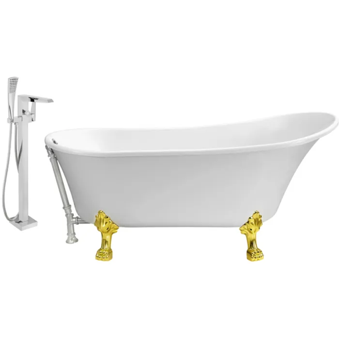 This Streamline vintage slipper style bathtub with a polished chrome tub faucet was designed to give your bathroom that classic timeless look. Tub's 67" glossy white exterior pairs up nicely with it’s detailed gold claw feet. The chrome exterior drain adds a finishing touch to that vintage look. You can submerge in a relaxing bath as this tub can hold up to 69 gallons of water.