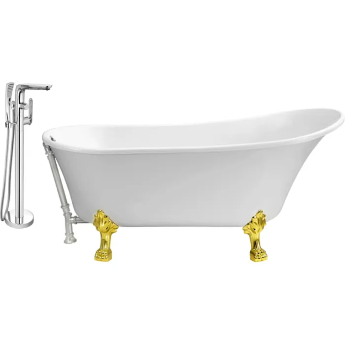 This Streamline vintage slipper style bathtub with a polished chrome tub faucet was designed to give your bathroom that classic timeless look. Tub's 67" glossy white exterior pairs up nicely with it’s detailed gold claw feet. The chrome exterior drain adds a finishing touch to that vintage look. You can submerge in a relaxing bath as this tub can hold up to 69 gallons of water.