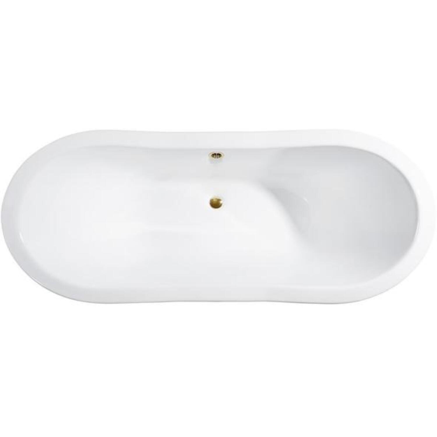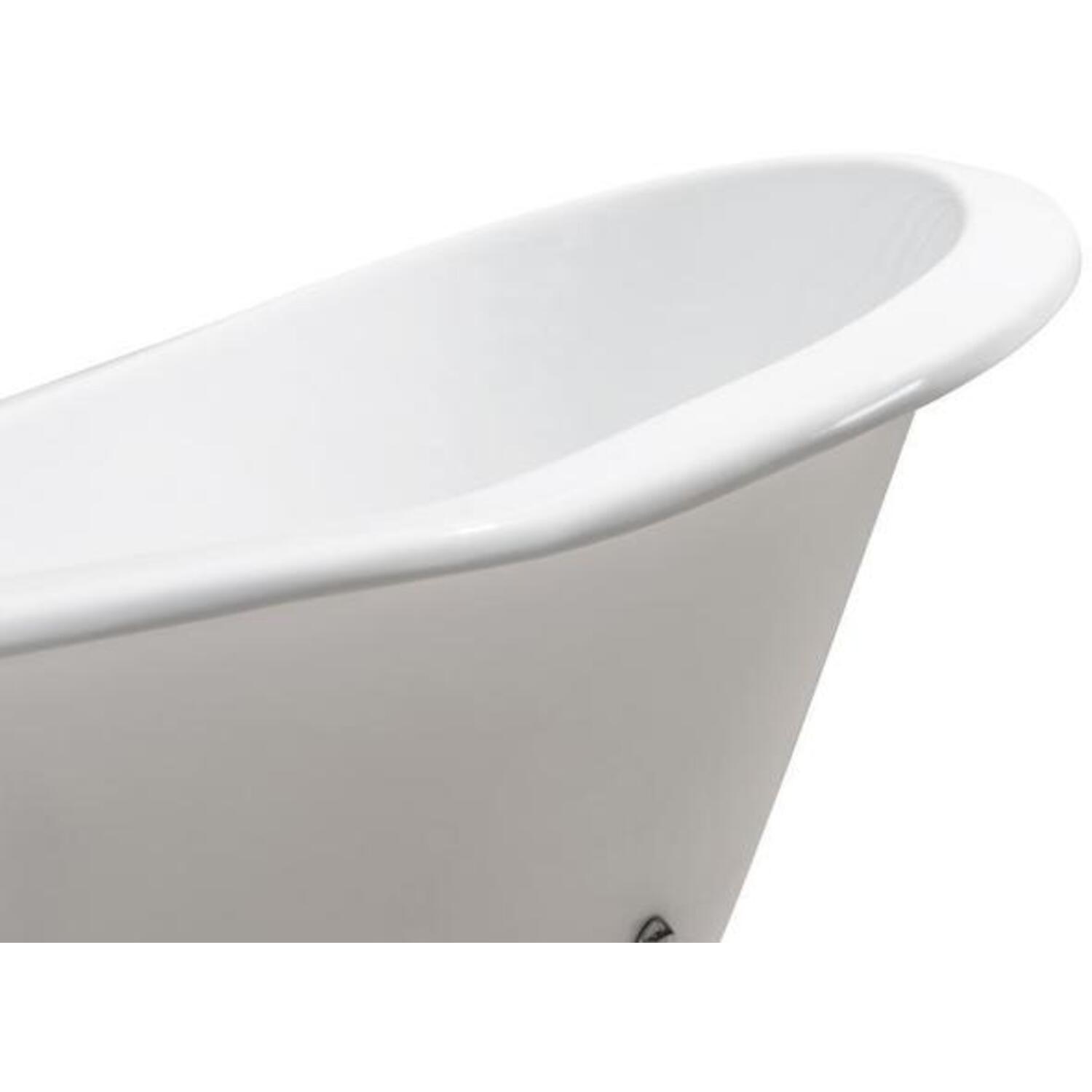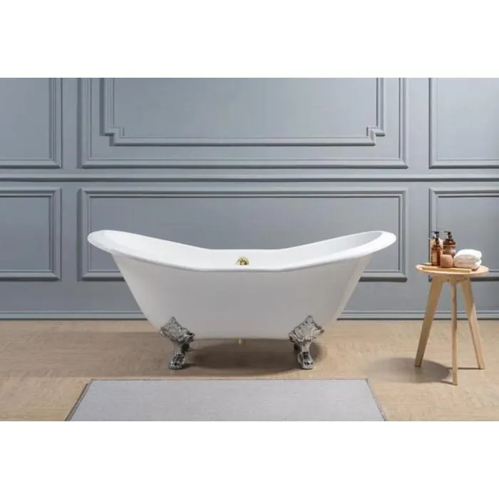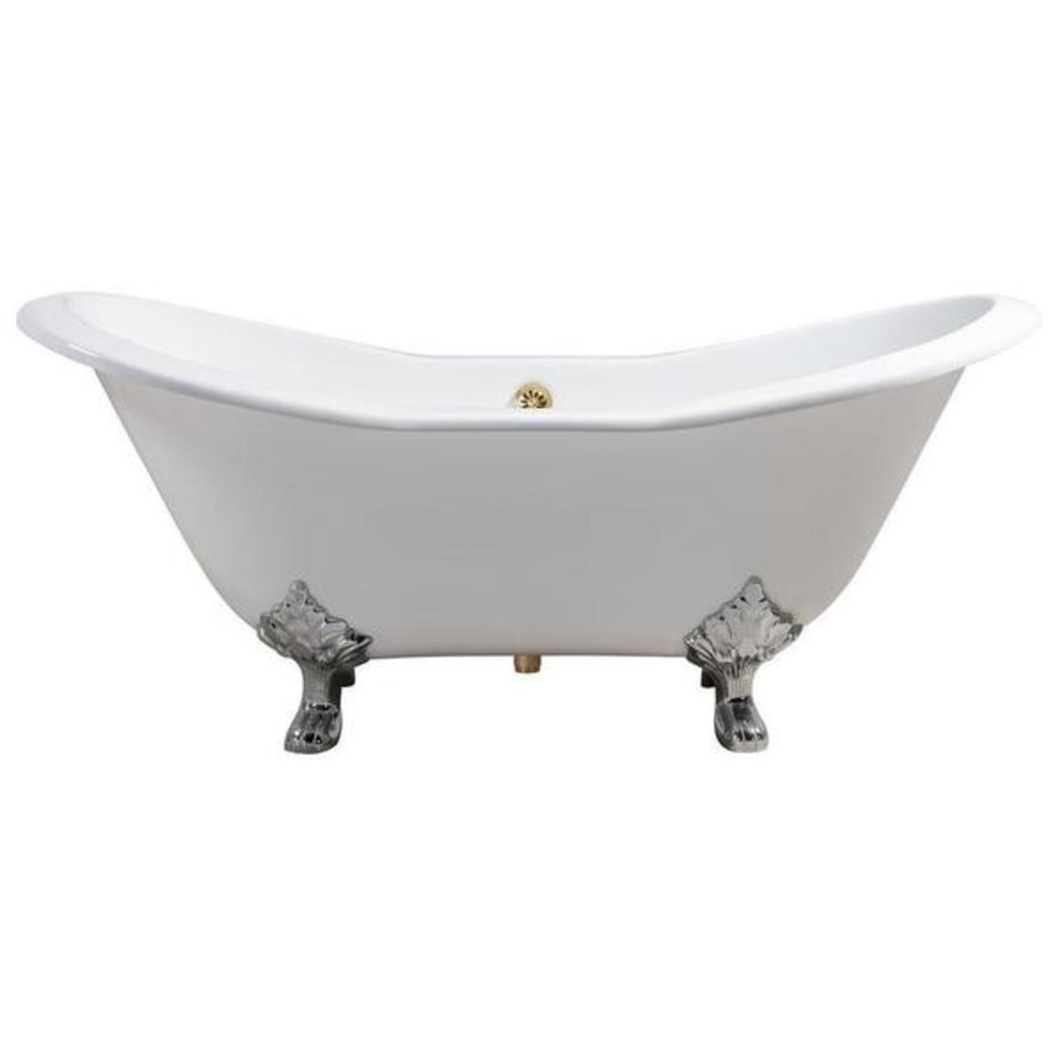 Soak in relaxation in this cast iron Streamline 72" vintage style clawfoot tub. It's white gloss exterior with chrome claw feet will accentuate any bathroom. This timeless tub has a gold external drain and can hold up to 55.5 gallons of water.