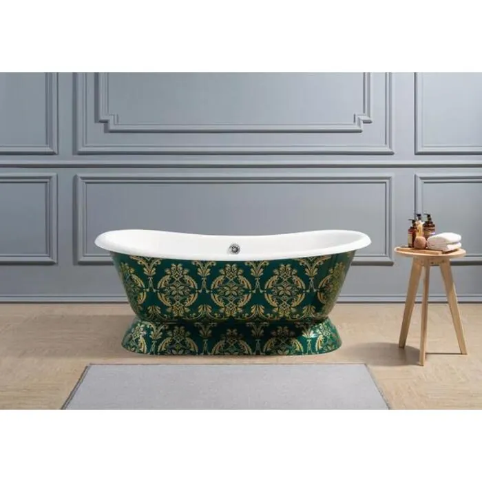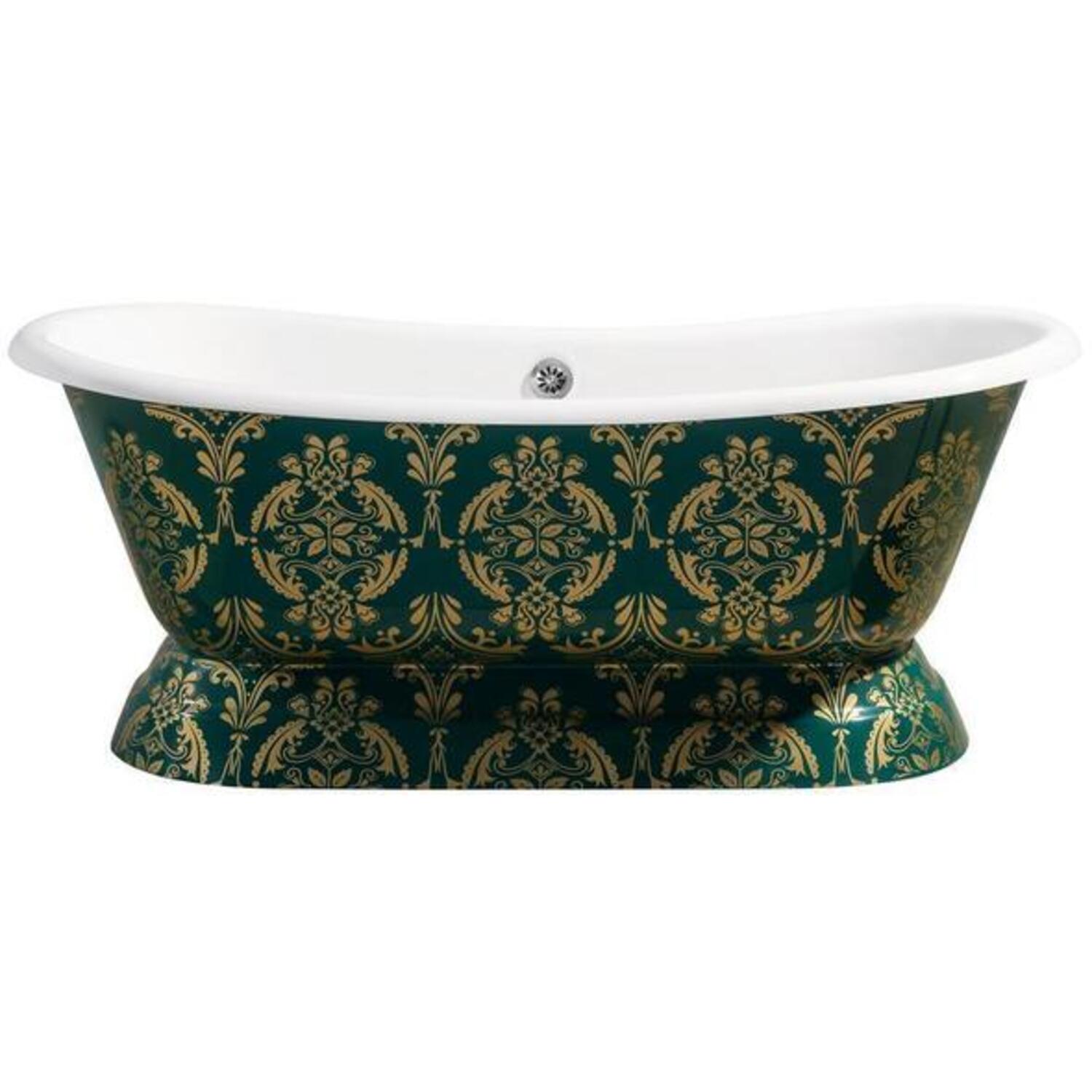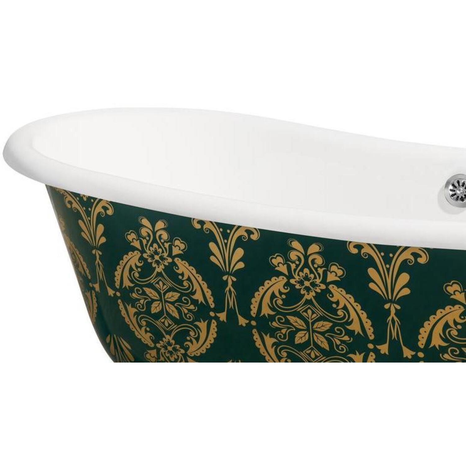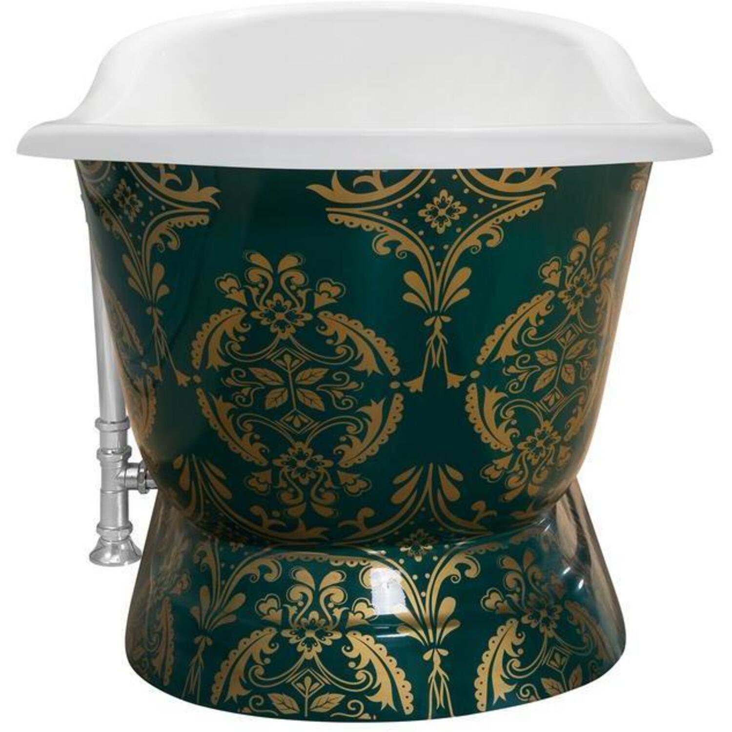 Relax in this cast iron Streamline 67” glossy green and gold traditional freestanding bathtub. This freestanding tub has an external chrome colored drain and can hold up to 62 gallons of water.
