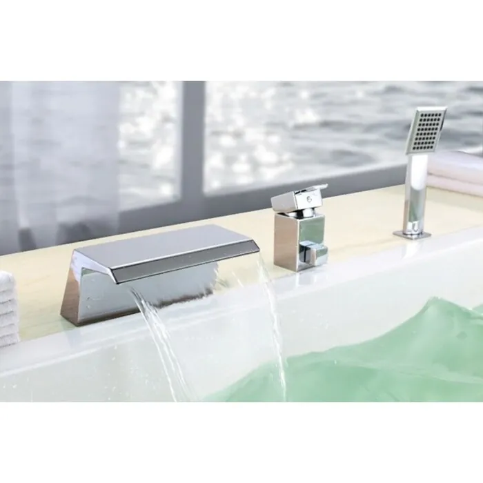 Series Waterfall Tub Faucet Item Weight 7.27 Ship State CA Material Stainless Steel Installation Type Deck Mount Includes Hand Held? Yes Valve Type Ceramic Disc Cartridge Handle Type Lever Number of Handles 1 Required Holes 3 Flow Rate (GPM) 2.2 Spout Reach 4 1/3 Spout Height 3 1/3 Theme Modern Finish Chrome Height 3 7/8