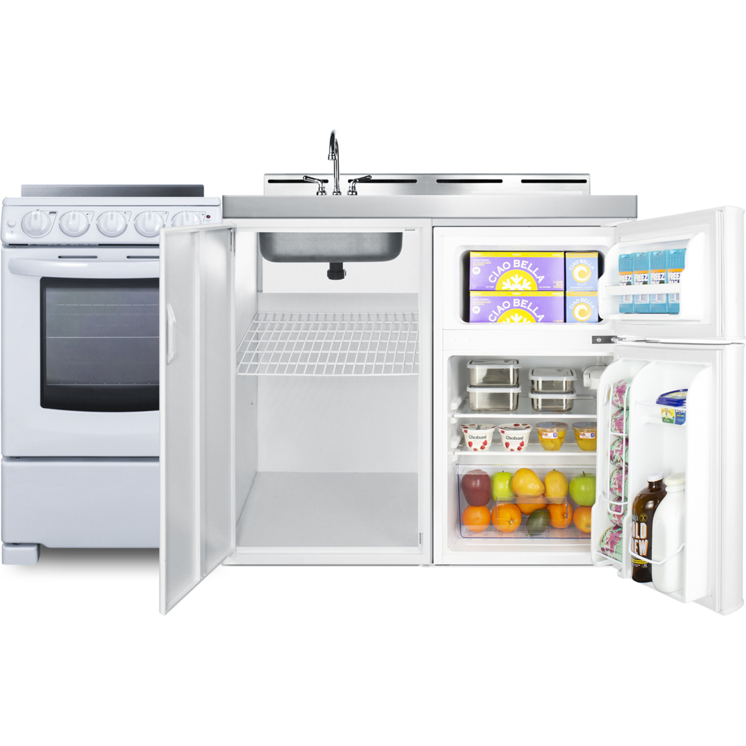 Summit's line of all-in-one combination kitchenettes brings complete kitchen convenience in a slim-fitting design. These units come fully featured with everything you need for the home foodservice experience, including a refrigerator with a freezer compartment, 4-burner smooth top range with oven, sink with faucet, cutlery bin with a removable cutting board cover, and storage cabinet for dry goods.