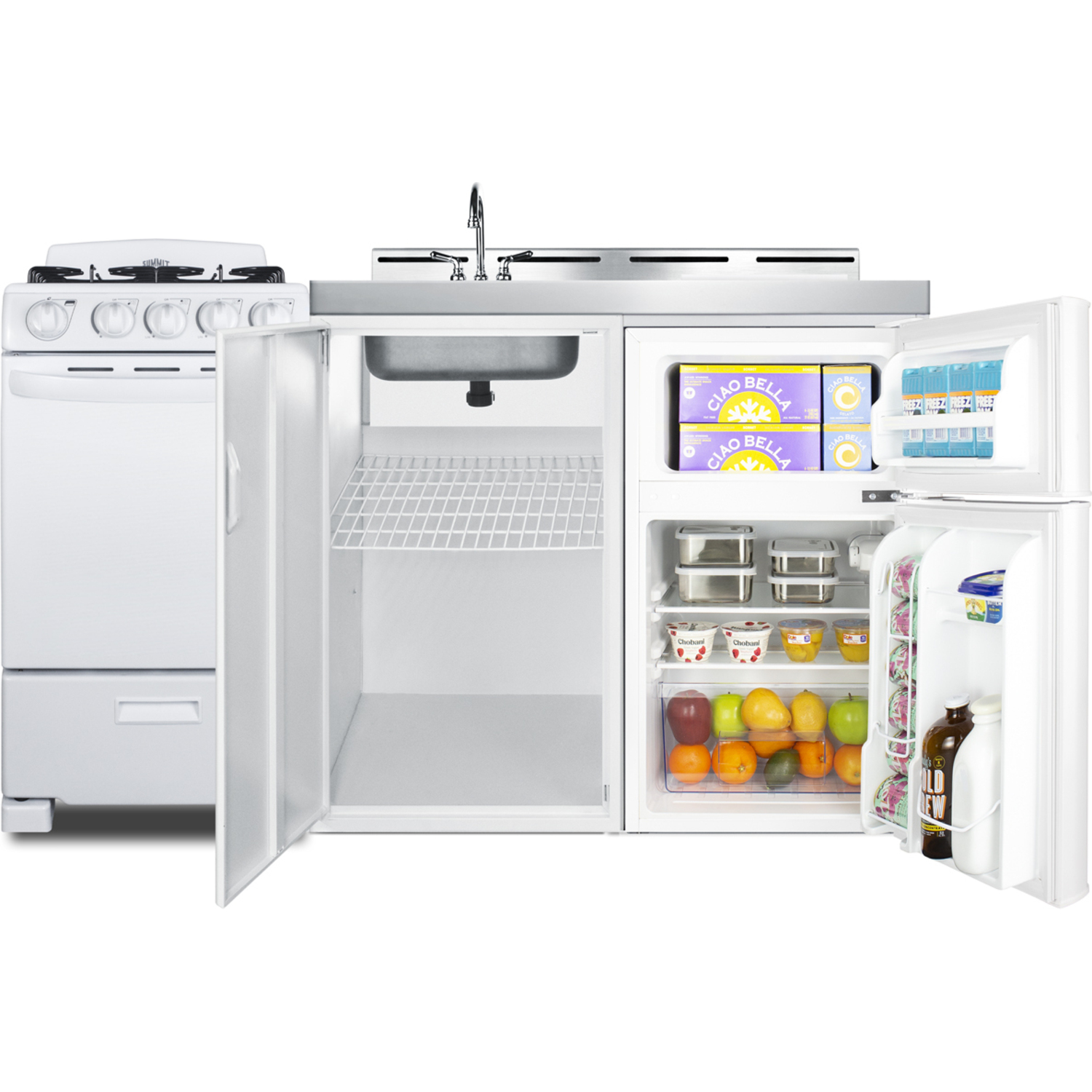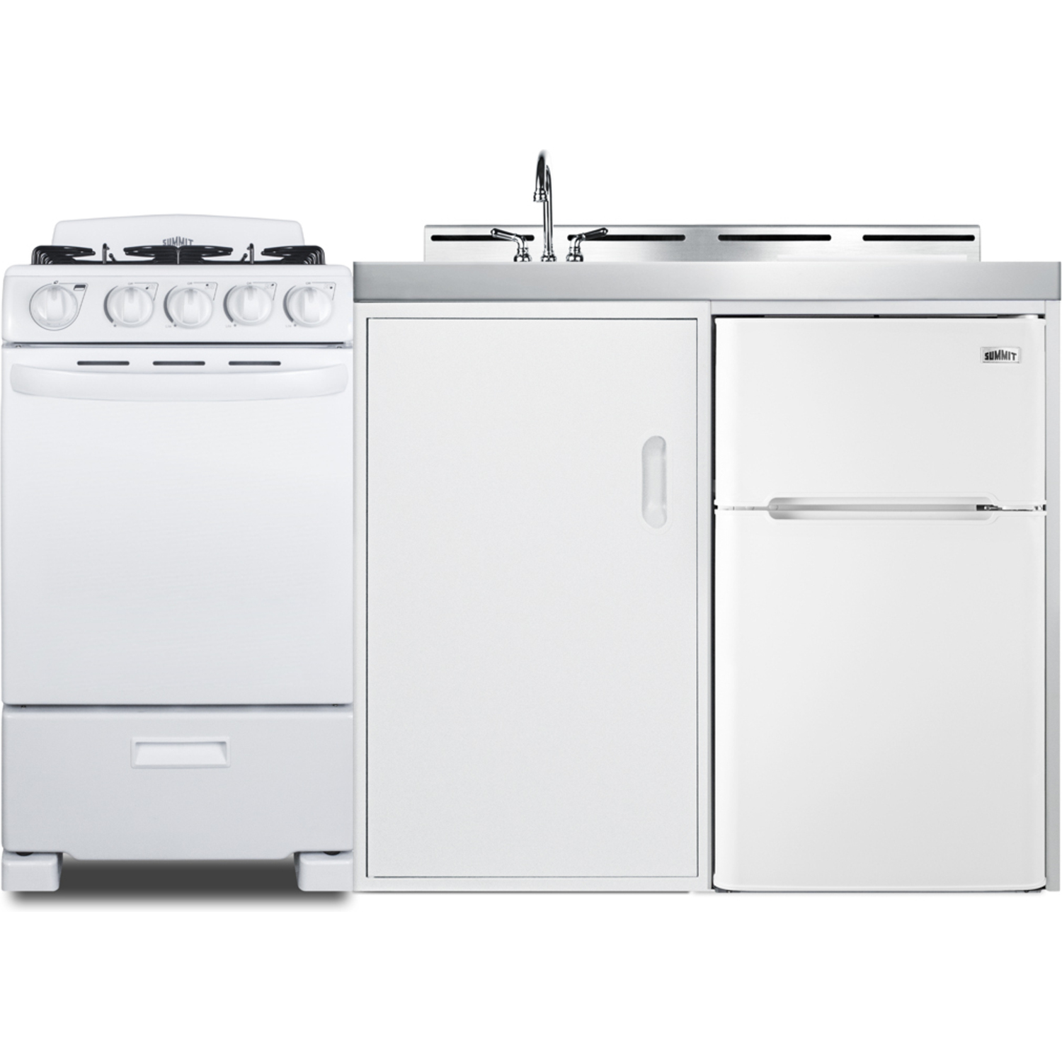 Summit's line of all-in-one combination kitchenettes brings complete kitchen convenience in a slim-fitting design. These units come fully featured with everything you need for the home foodservice experience, including a refrigerator with a freezer compartment, 4-burner gas range with oven, sink with faucet, cutlery bin with a removable cutting board cover, and storage cabinet for dry goods.