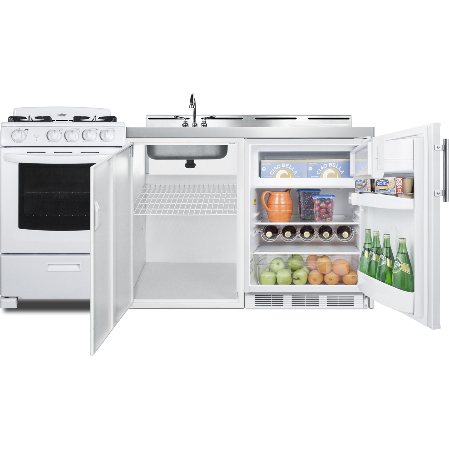 Summit's line of all-in-one combination kitchenettes brings complete kitchen convenience in a slim-fitting design. These units come fully featured with everything you need for the home foodservice experience, including a refrigerator with a freezer compartment, 4-burner gas range with oven, sink with faucet, cutlery bin with a removable cutting board cover, and storage cabinet for dry goods.