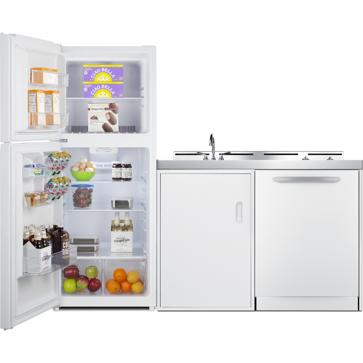 SUMMIT brings innovative value into the kitchen with all-in-one combination units for full-service use. Our ACKDW series features a full-sized refrigerator-freezer, dishwasher, 2-burner cooktop, sink, and storage cabinet to create a complete one-wall kitchenette.