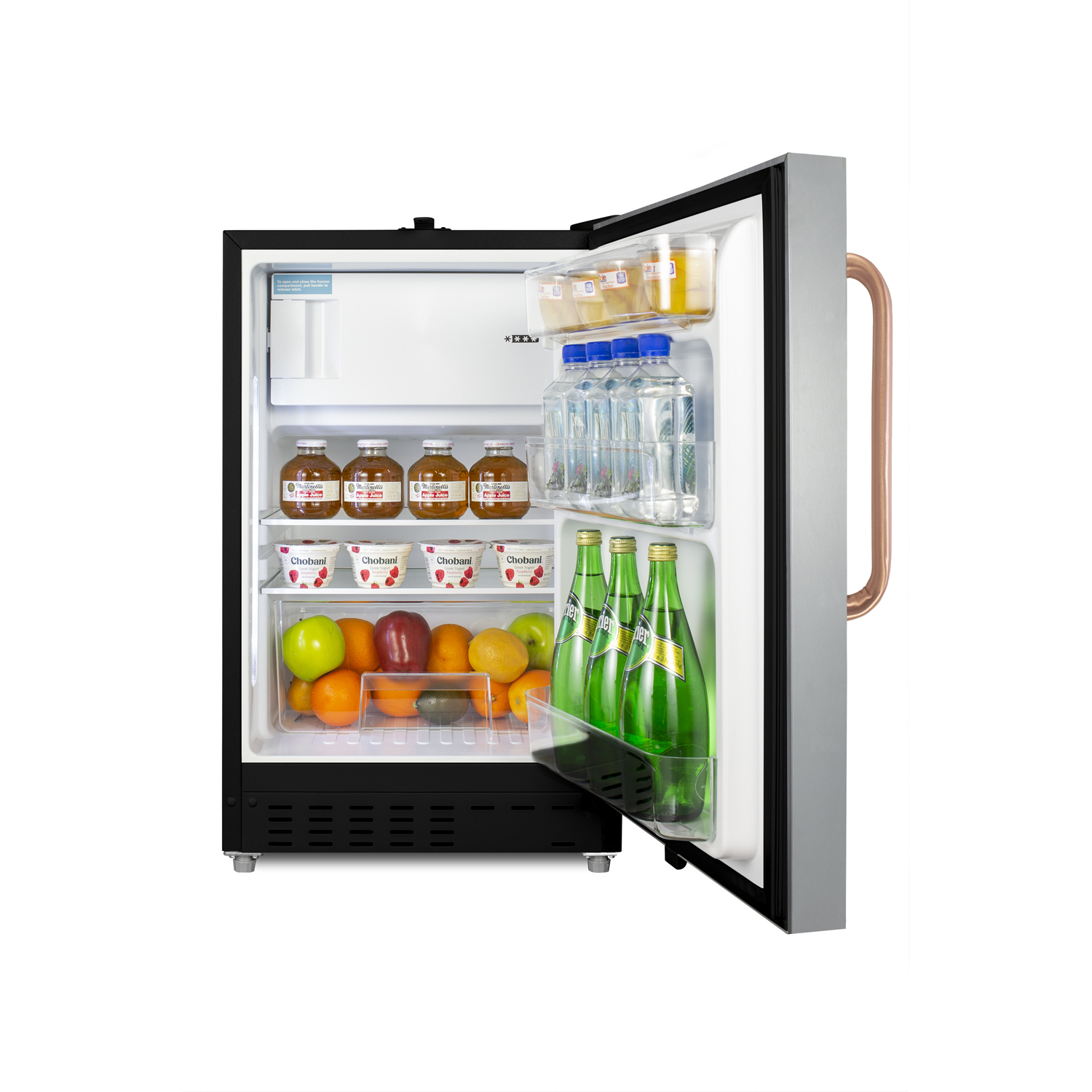 Inside, the ADA302BRFZSSTBC features an all-white 2.68 cu.ft. interior for easy cleaning, with static manual defrost operation and a dial thermostat. An automatic LED light located toward the front of the unit illuminates the interior for full visibility. Three spill-proof adjustable glass shelves offer flexible storage options and a removable clear crisper drawer holds additioal items as needed. The door includes three removable racks. This unit includes a compact freezer compartment with an interior swing door, perfect for ice cube trays, ice packs, or additional supplies in need of freezing.