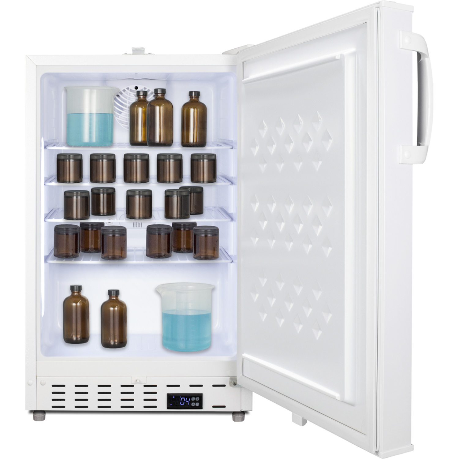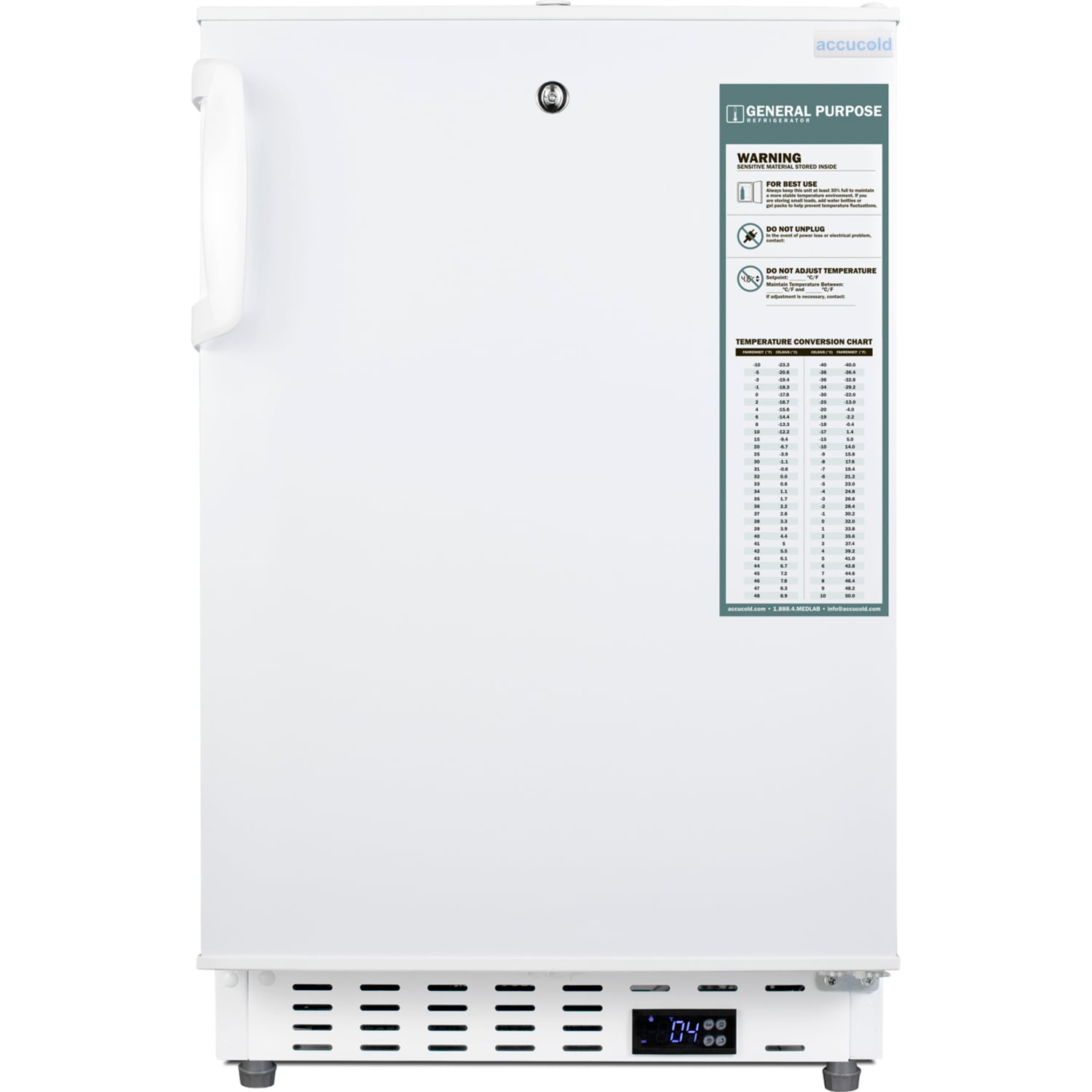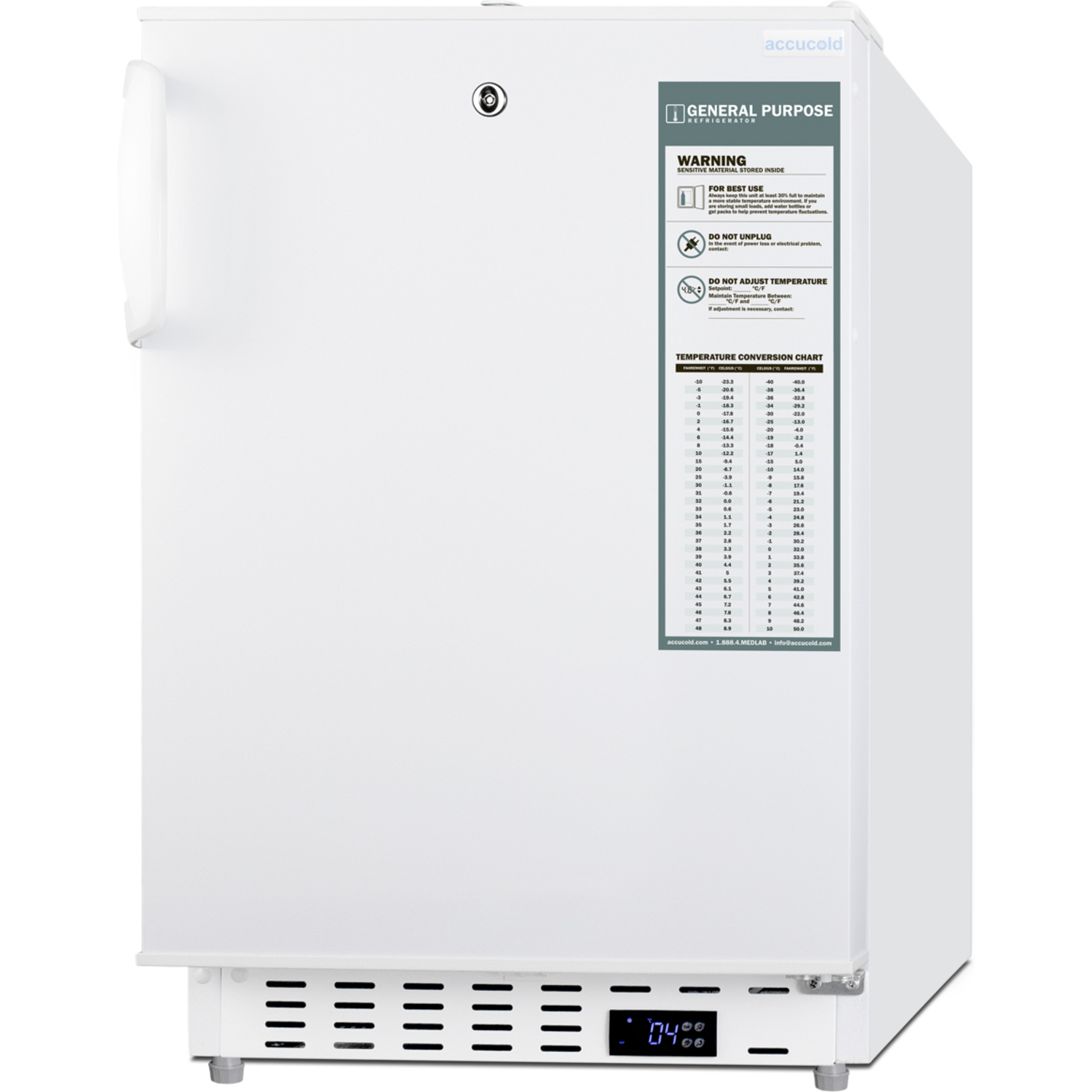 - Built-in undercounter ADA compliant 2 to -8°C commercially approved all-refrigerator in white with lock, digital controls, wire shelving, hospital cord with 'green dot' plug, factory installed access port, and automatic defrost operation