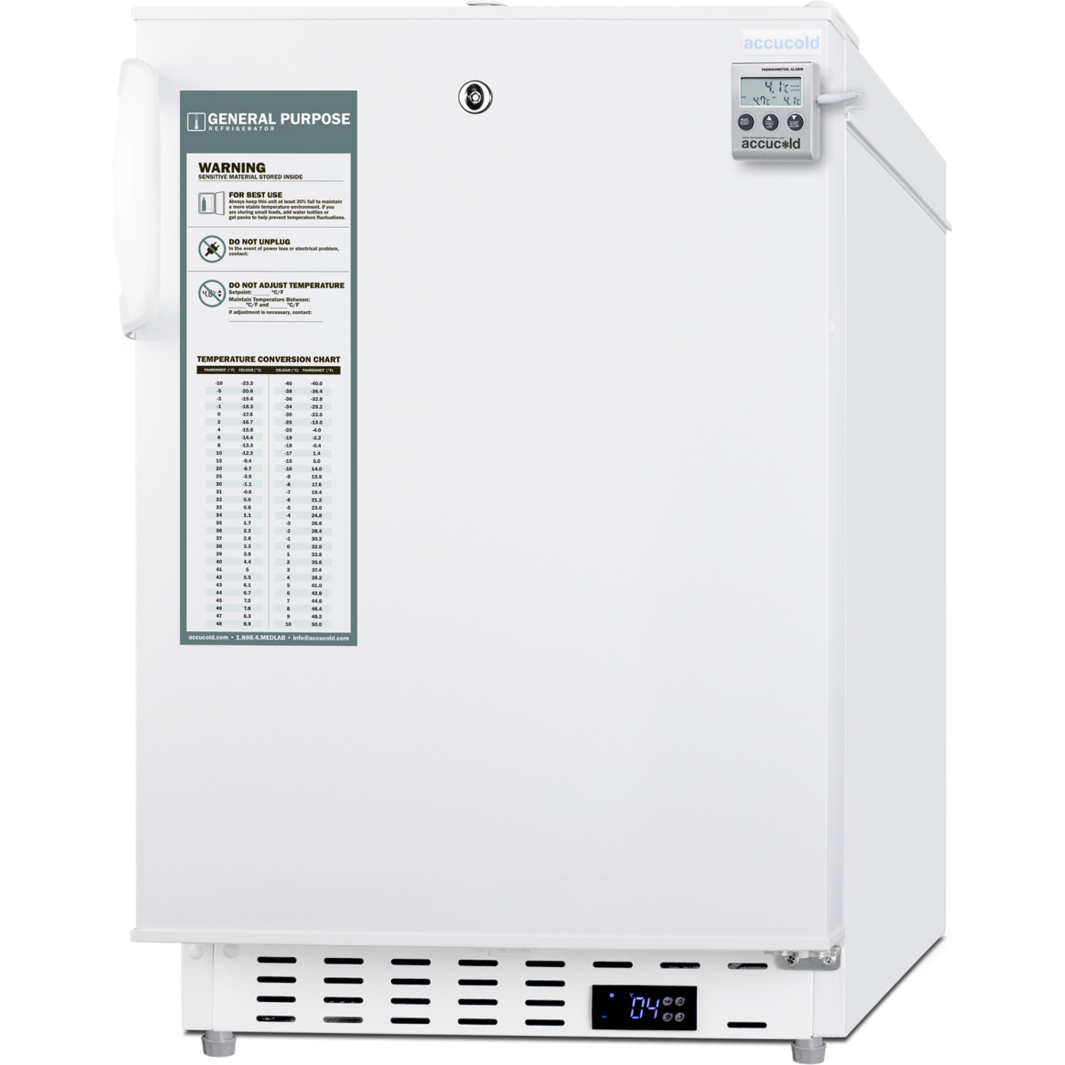 NOTE: Accucold refrigerators are purpose-built to the support meeting the current CDC (Centers for Disease Control) guidelines for the storage of vaccines. At this time, Accucold refrigerators have not been evaluated to the new NSF 456 standard. As referenced in the current Vaccine Storage and Handling Toolkit, these units incorporate microprocessor controls and forced air circulation for stable operation between 2 and 8ºC. For additional temperature assurance, the CDC recommends a calibrated digital data logger (DDL), which can be added with the factory-installed option DL2B or addition of the DL2BKit accessory.Nominal Height: 32